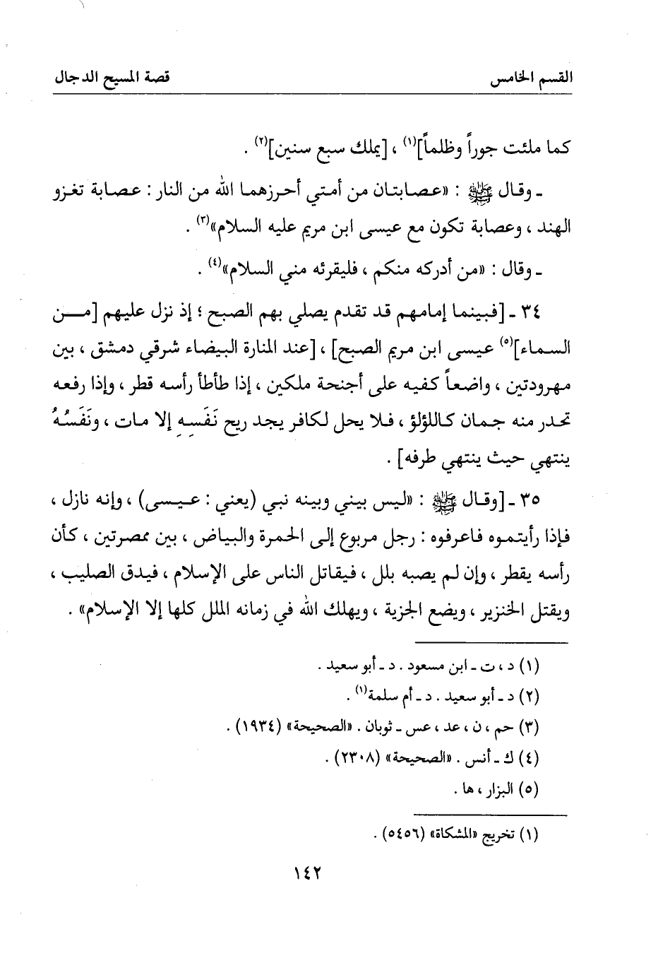 35 - [ليس بيني وبينه نبي (يعني: عيسى) وإنه نازل فإذا رأيتموه فاعرفوه: رجل مربوع إلى الحمرة والبياض بين ممصرتين كأن رأسه يقطر وإن لم يصبه بلل فيقاتل الناس على الإسلام فيدق الصليب ويقتل الخنزير ويضع الجزية ويهلك الله في زمانه الملل كلها إلا الإسلام)