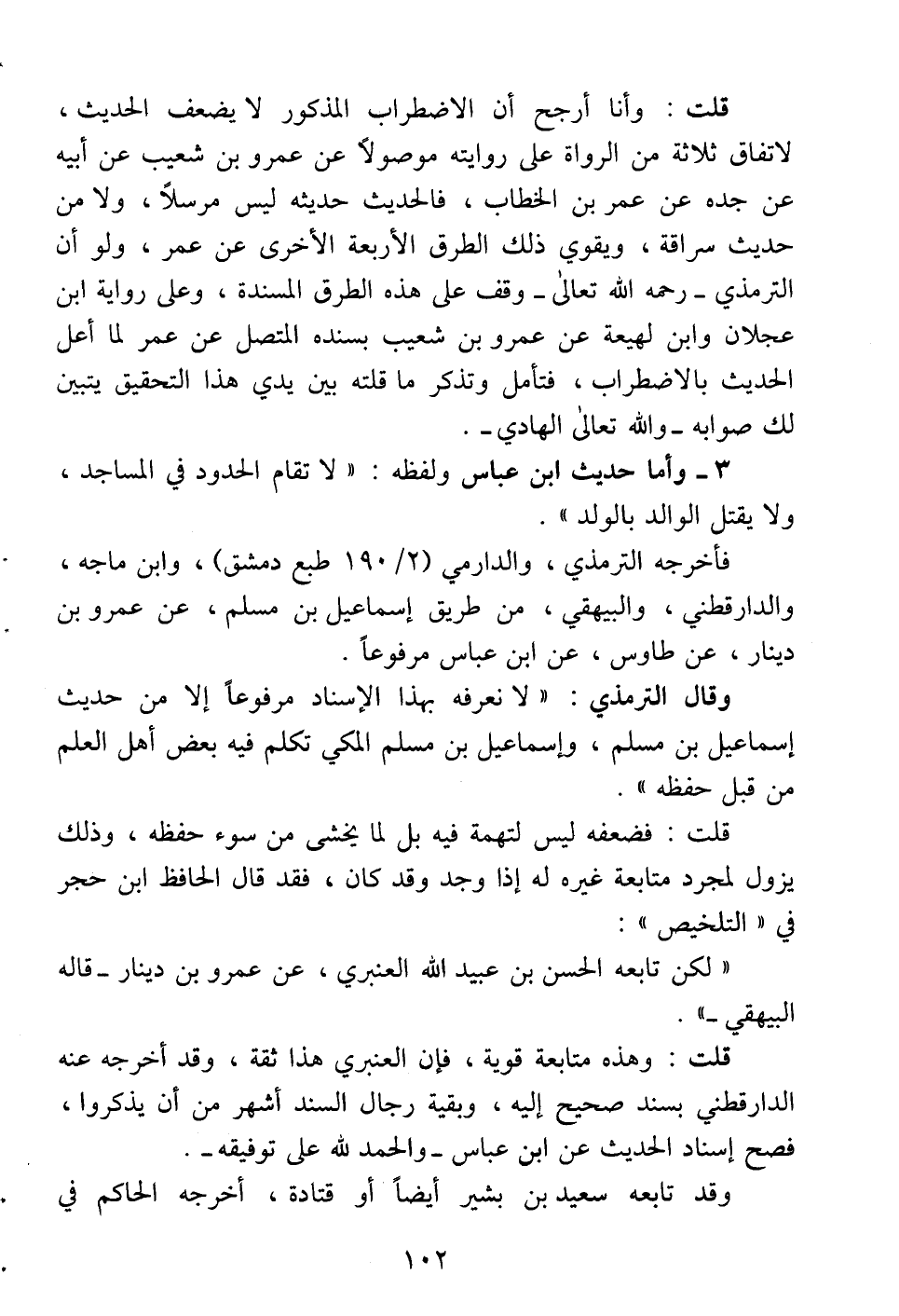 قلت: وأنا أرجح أن الاضطراب المذكور لا يضعف الحديث، لاتفاق ثلاثة من الرواة على روايته موصولاً عن عمرو بن شعيب عن أبيه عن جده عن عمر بن الخطاب، فالحديث حديثه ليس مرسلاً، ولا من حديث سراقة، ويقوي ذلك الطرق الأربعة الأخرى عن عمر، ولو أن الترمذي -رحمه الله تعالى- وقف على هذه الطرق المسندة، وعلى رواية ابن عجلان وابن لهيعة عن عمرو بن شعيب بسنده المتصل عن عمر لما أعل الحديث بالاضطراب، فتأمل وتذكر ما قلته بين يدي هذا التحقيق يتبين لك صوابه -والله تعالى الهادي-.