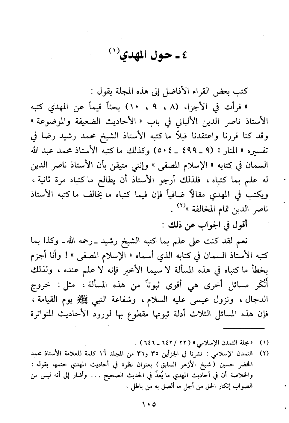 (¬2) التمدن الإسلامي: نشرنا في الجزأين 35 و 36 من المجلد 16 كلمة للعلامة الأستاذ محمد الخضر حسين (شيخ الأزهر السابق) بعنوان نظرة في أحاديث المهدي ختمها بقوله: والخلاصة أن في أحاديث المهدي ما يُعدَّ في الحديث الصحيح. . . وأشار إلى أنه ليس من الصواب إنكار الحق من أجل ما ألصق به من باطل.