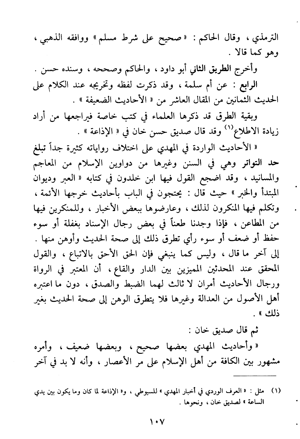 " الأحاديث الواردة في المهدي على اختلاف رواياته كثيرة جداً تبلغ حد التواتر وهي في السنن وغيرها من دواوين الإسلام من المعاجم والمسانيد، وقد اضجع القول فيها ابن خلدون في كتابه " العبر وديوان المبتدأ والخبر " حيث قال: يحتجون في الباب بأحاديث خرجها الأئمة، وتكلم فيها المنكرون لذلك، وعارضوها ببعض الأخبار، وللمنكرين فيها من المطاعن، فإذا وجدنا طعناً في بعض رجال الإسناد بغفلة أو سوء حفظ أو ضعف أو سوء رأي تطرق ذلك إلى صحة الحديث وأوهن منها. إلى آخر ما قال، وليس كما ينبغي فإن الحق الأحق بالاتباع، والقول المحقق عند المحدثين المميزين بين الدار والقاع، أن المعتبر في الرواة ورجال الأحاديث أمران لا ثالث لهما الضبط والصدق، دون ما اعتبره أهل الأصول من العدالة وغيرها فلا يتطرق الوهن إلى صحة الحديث بغير ذلك ".