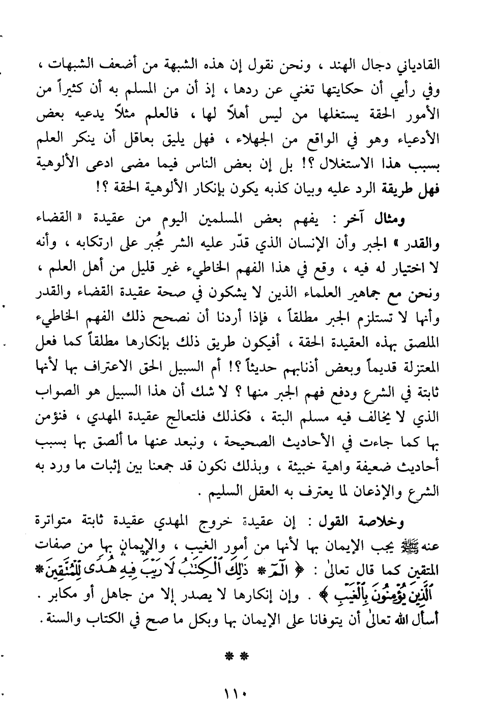 وخلاصة القول: إن عقيدة خروج المهدي عقيدة ثابتة متواترة عنه -صلى الله عليه وسلم- يجب الإيمان بها لأنها من أمور الغيب، والإيمان بها من صفات المتقين كما قال تعالى: {الم * ذلك الكتاب لا ريب فيه هدى للمتقين * الذين يؤمنون بالغيب}. وإن إنكارها لا يصدر إلا من جاهل أو مكابر. أسأل الله تعالى أن يتوفانا على الإيمان بها وبكل ما صح في الكتاب والسنة.