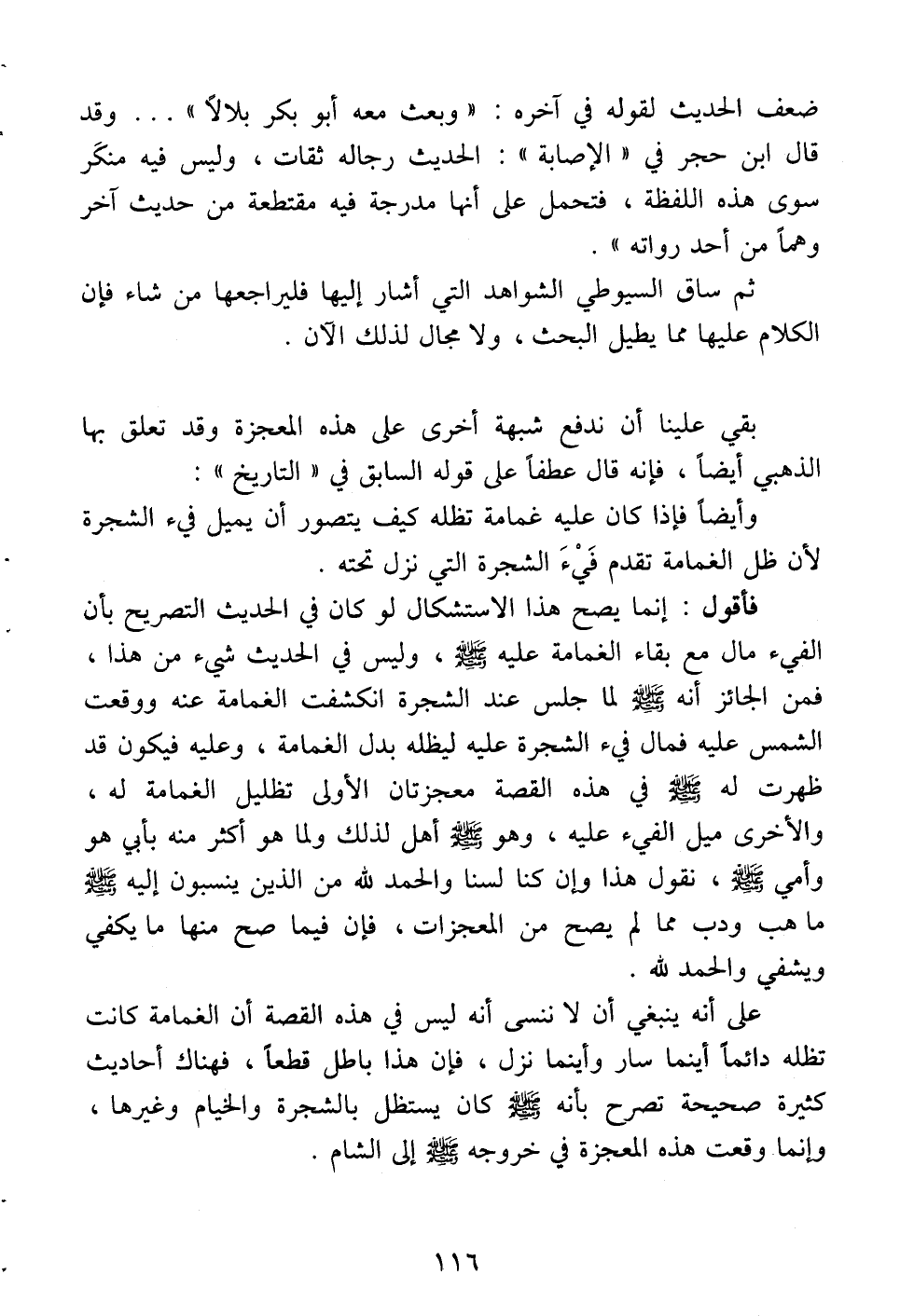 على أنه ينبغي أن لا ننسى أنه ليس في هذه القصة أن الغمامة كانت تظله دائماً أينما سار وأينما نزل، فإن هذا باطل قطعاً، فهناك أحاديث كثيرة صحيحة تصرح بأنه -صلى الله عليه وسلم- كان يستظل بالشجرة والخيام وغيرها، وإنما وقعت هذه المعجزة في خروجه -صلى الله عليه وسلم- إلى الشام.