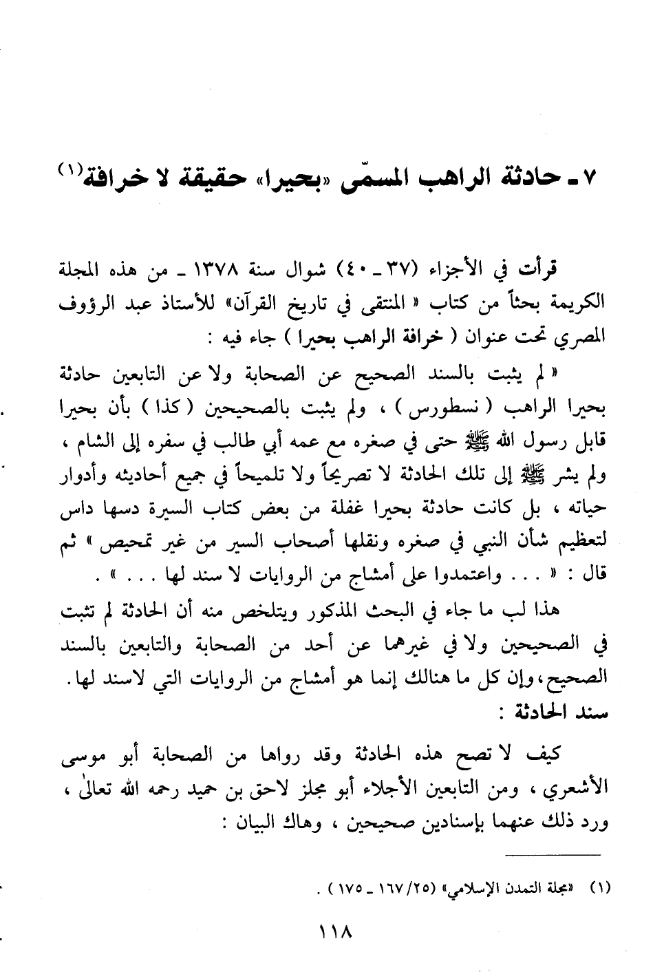 قرأت في الأجزاء (77 - 40) شوال سنة 1378 - من هذه المجلة الكريمة بحثاً من كتاب " المنتقى في تاريخ القرآن " للأستاذ عبد الرؤوف المصري تحت عنوان (خرافة الراهب بحيرا) جاء فيه: