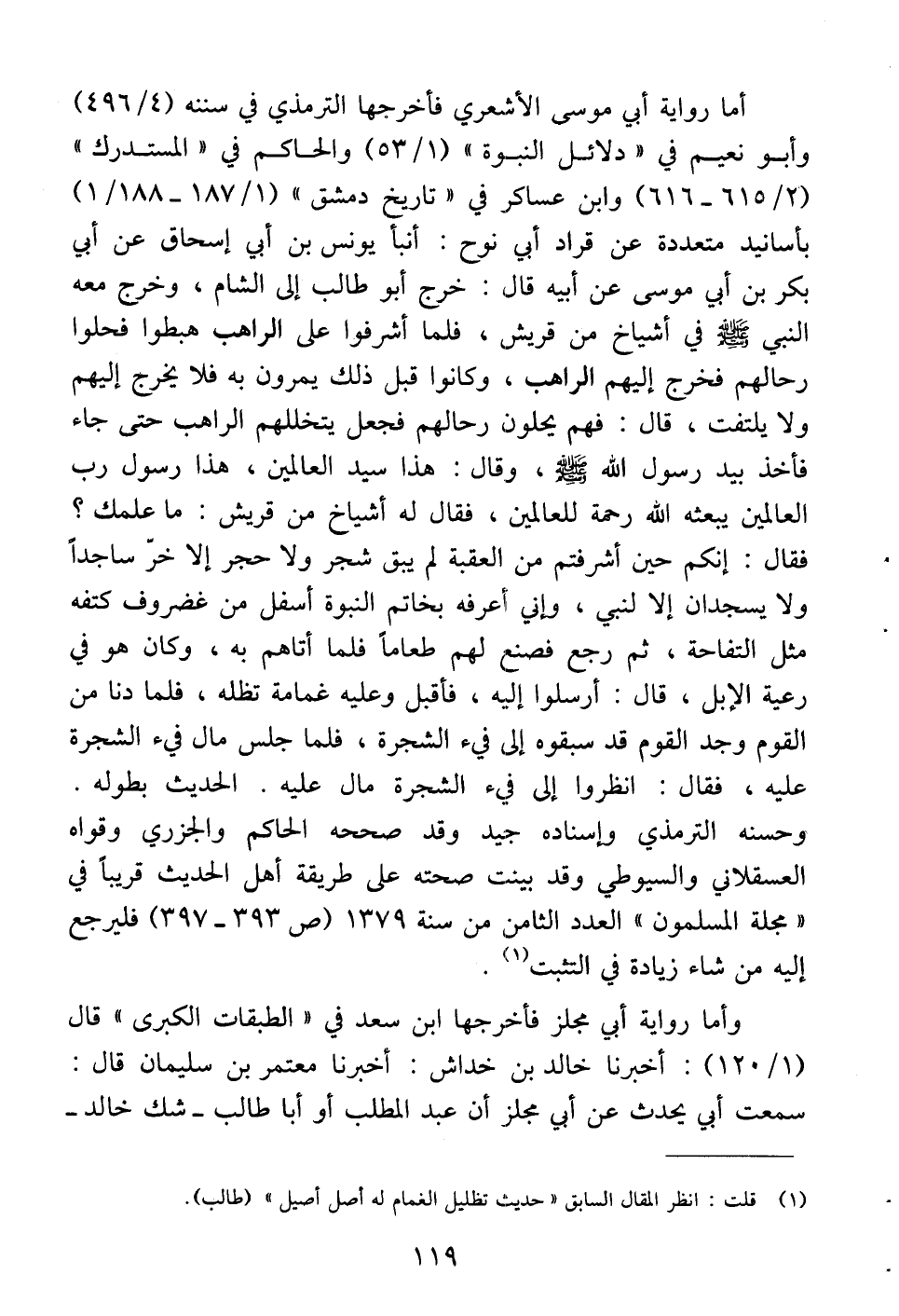 أما رواية أبي موسى الأشعري فأخرجها الترمذي في سننه (4/ 496) وأبو نعيم في " دلاثل النبوة " (1/ 53) والحاكم في " المستدرك " (12/ 615 - 616) وابن عساكر في " تاريخ دمشق " (6/ 187 - 188/ 1) بأسانيد متعددة عن قراد أبي نوح: أنبأ يونس بن أبي إسحاق عن أبي بكر بن أبي موسى عن أبيه قال: خرج أبو طالب إلى الشام، وخرج معه النبي -صلى الله عليه وسلم- في أشياخ من قريش، فلما أشرفوا على الراهب هبطوا فعلوا رحالهم فخرج إليهم الراهب، وكانوا قبل ذلك يمرون به فلا يخرج إليهم ولا يلتفت، قال: فهم يحلون رحالهم فجعل يتخللهم الراهب حتى جاء فأخذ بيد رسول الله -صلى الله عليه وسلم-، وقال: هذا سيد العالمين، هذا رسول رب العالمين يبعثه الله رحمة للعالمين، فقال له أشياخ من قريش: ما علمك؟ فقال: إنكم حين أشرفتم من العقبة لم يبق شجر ولا حجر إلا خر ساجداً ولا يسجدان إلا لنبي، وإني أعرفه بخاتم النبوة أسفل من غضروف كتفه مثل التفاحة، ثم رجع فصنع لهم طعاماً فلما أتاهم به، وكان هو في رعية الإبل، قال: أرسلوا إليه، فأقبل وعليه غمامة تظله، فلما دنا من القوم وجد القوم قد سبقوه إلى فيء الشجرة، فلما جلس مال فيء الشجرة عليه، فقال: انظروا إلى فيء الشجرة مال عليه. الحديث بطوله. وحسنه الترمذي وإسناده جيد وقد صححه الحاكم والجزري وقواه العسقلاني والسيوطي وقد بينت صحته على طريقة أهل الحديث قريباً في "مجلة المسلمون" العدد الثامن من سنة 1379 (ص 393 - 397) فليرجع إليه من أراد زيادة في التثبت (¬1).
