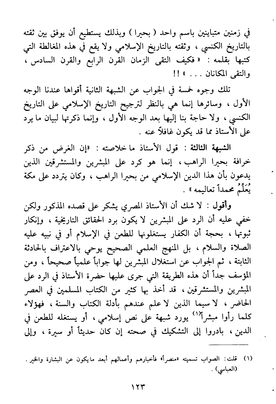 الشبهة الثالثة: قول الأستاذ ما خلاصته: " إن الغرض من ذكر خرافة بحيرا الراهب، إنما هو كرد على المبشرين والمستشرقين الذين يدعون بأن هذا الدين الإسلامي من بحيرا الراهب، وكان يتردد على مكة يعلم محمداً تعاليمه ".