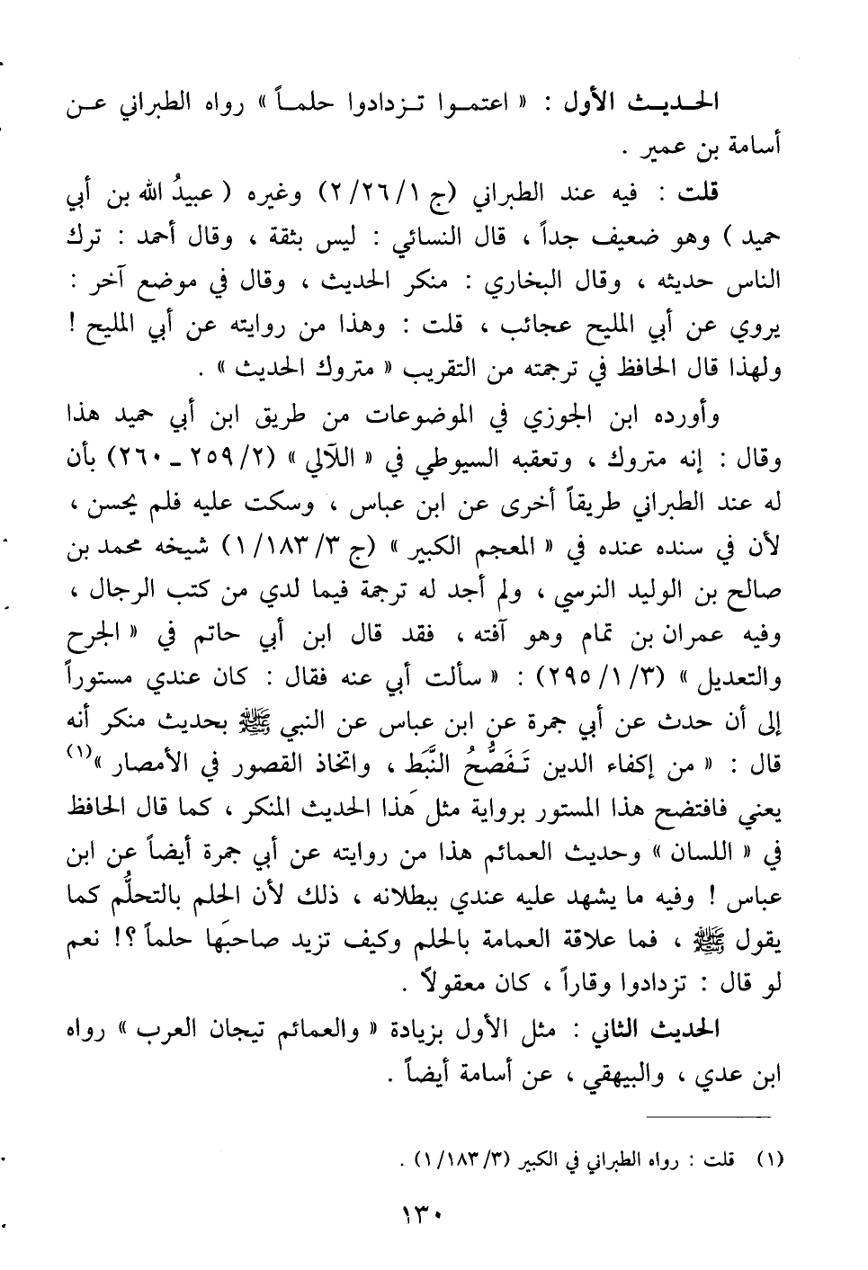 وأورده ابن الجوزي في الموضوعات من طريق ابن أبي حميد هذا وقال: إنه متروك، وتعقبه السيوطي في " اللآلي " (2/ 295 - 296) بأن له عند الطبراني طريقاً أخرى عن ابن عباس، وسكت عليه فلم يحسن، لأن في سنده عنده في " المعجم الكبير " (ج 3/ 183 / 1) شيخه محمد بن صالح بن الوليد النرسي، ولم أجد له ترجمة فيما لدي من كتب الرجال، وفيه عمران بن تمام وهو آفته، فقد قال ابن أبي حاتم في " الجرح والتعديل " (3/ 1 / 295): " سألت أبي عنه فقال: كان عندي مستوراً إلى أن حدث عن أبي جمرة عن ابن عباس عن النبي -صلى الله عليه وسلم- بحديث منكر أنه قال: " من إكفاء الدين تفصح النبط، واتخاذ القصور في الأمصار " (¬1) يعني فافتضح هذا المستور برواية مثل هذا الحديث المنكر، كما قال الحافظ في " اللسان " وحديث العمائم هذا من روايته عن أبي جمرة أيضاً عن ابن عباس! وفيه ما يشهد عليه عندي ببطلانه، ذلك لأن الحلم بالتحلم كما يقول -صلى الله عليه وسلم-، فما علاقة العمامة بالحلم وكيف تزد صاحبها حلماً؟! نعم لو قال: تزدادوا وقاراً، كان معقولاً.