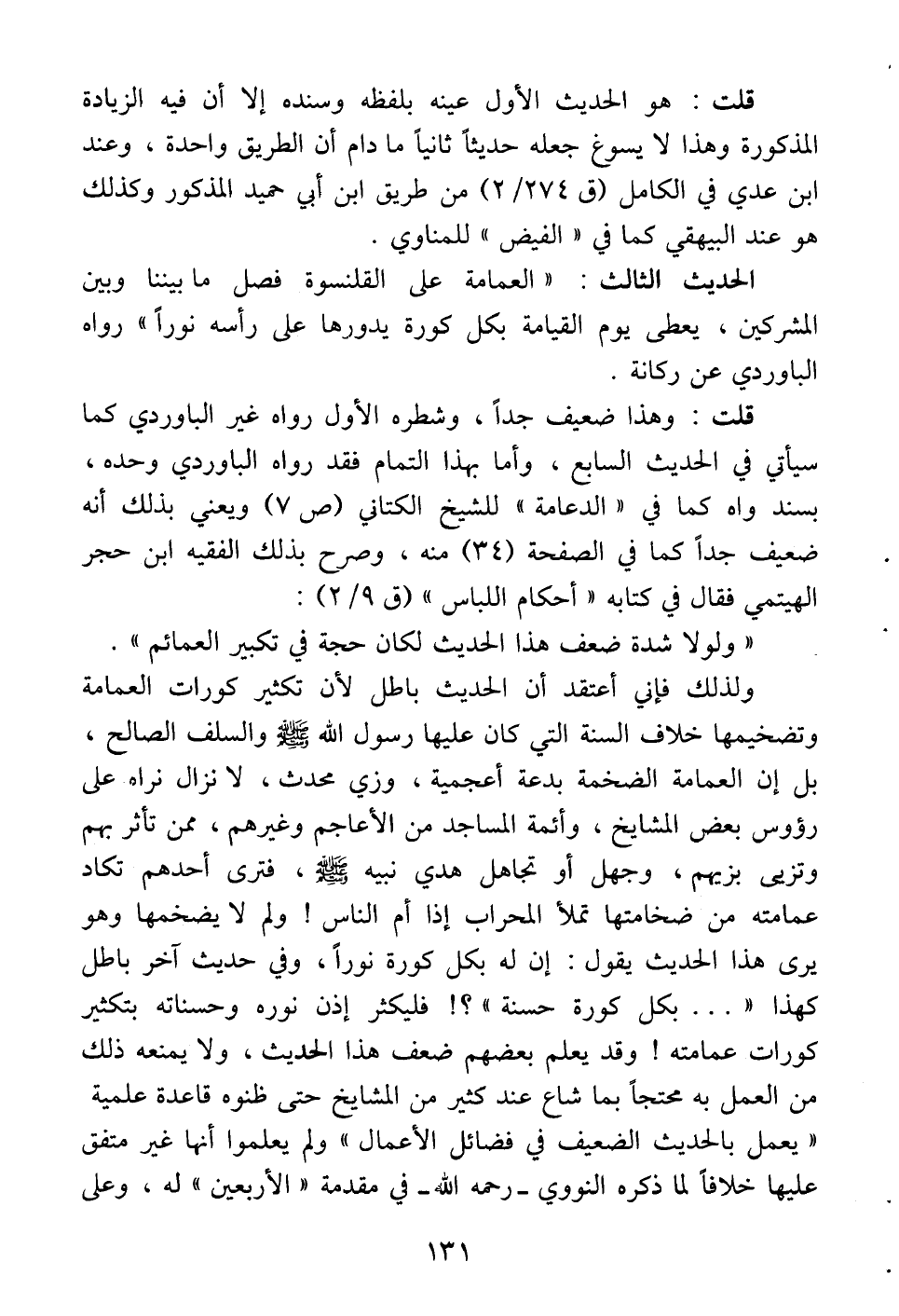 ولذلك فإني أعتقد أن الحديث باطل لأن تكثير كورات العمامة وتضخيمها خلاف السنة التي كان عليها رسول الله -صلى الله عليه وسلم- والسلف الصالح، بل إن العمامة الضخمة بدعة أعجمية، وزي محدث، لا نزال نراه على رؤوس بعض المشايخ، وأئمة المساجد من الأعاجم وغيرهم، ممن تأثر بهم وتزيى بزيهم، وجهل أو تجاهل هدي نبيه -صلى الله عليه وسلم-، فترى أحدهم تكاد عمامتهم من فخامتها تملأ المحراب إذا أم الناس! ولم لا يضخمها وهو يرى هذا الحديث يقول: إن له بكل كورة نوراً، وفي حديث آخر باطل كهذا ". . . بكل كورة حسنة "؟! فليكثر إذن نوره وحسناته بتكثير كورات عمامته! وقد يعلم بعضهم بضعف هذا الحديث، ولا يمنعه ذلك من العمل به محتجاً بما شاع عند كثير من المشايخ حتى ظنوه قاعدة علمية " يعمل بالحديث الضعيف في فضائل الأعمال " ولم يعلموا أنها غير متفق عليها خلافاً لما ذكره النووي -رحمه الله- في مقدمة " الأربعين " له، وعلى