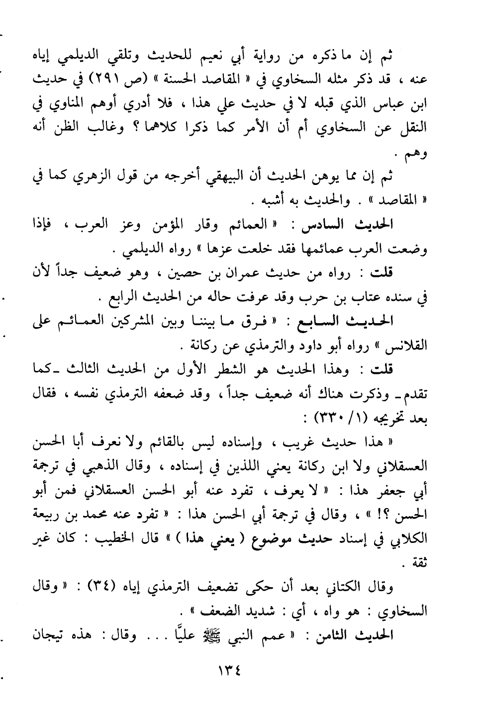 الحديث السادس: " العمائم وقار المؤمن وعز العرب، فإذا وضعت العرب عمائمها فقد خلعت عزها " رواه الديلمي.