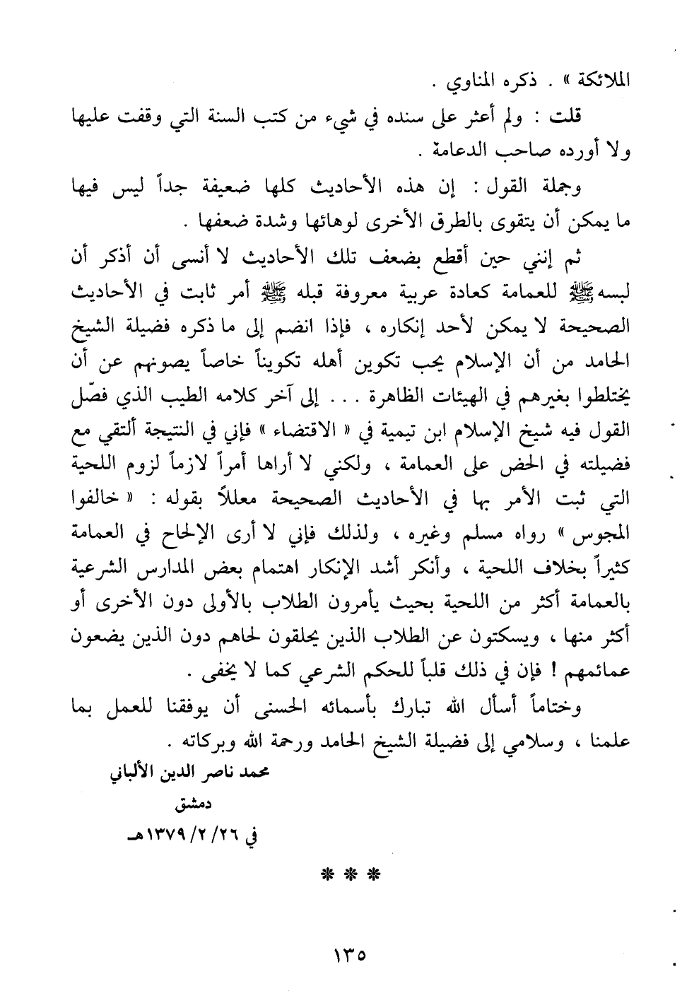 ثم إنني حين أقطع بضعف تلك الأحاديث لا أنسى أن أذكر أن لبسه -صلى الله عليه وسلم- للعمامة كعادة عربية معروفة قبله -صلى الله عليه وسلم- أمر ثابت في الأحاديث الصحيحة لا يمكن لأحد إنكاره، فإذا انضم إلى ما ذكره فضيلة الشيخ الحامد من أن الإسلام يحب تكوين أهله تكويناً خاصاً يصونهم عن أن يختلطوا بغيرهم في الهيئات الظاهرة. . . إلى آخر كلامه الطيب الذي فصل القول فيه شيخ الإسلام ابن تيمية في " الاقتضاء " فإني في النتيجة ألتقي مع فضيلته في الحض على العمامة، ولكني لا أراها أمراً لازماً لزوم اللحية التي ثبت الأمر بها في الأحاديث الصحيحة معللاً بقوله: " خالفوا المجوس " رواه مسلم وغيره، ولذلك فإني لا أرى الإلحاح في العمامة كثيراً بخلاف اللحية، وأنكر أشد الإنكار اهتمام بعض المدارس الشرعية بالعمامة أكثر من اللحية بحيث يأمرون الطلاب بالأول دون الأخرى أو أكثر منها، ويسكتون عن الطلاب الذين يحلقون لحاهم دون الذين يضعون عمائمهم! فإن في ذلك قلباً للحكم الشرعي كما لا يخفى.