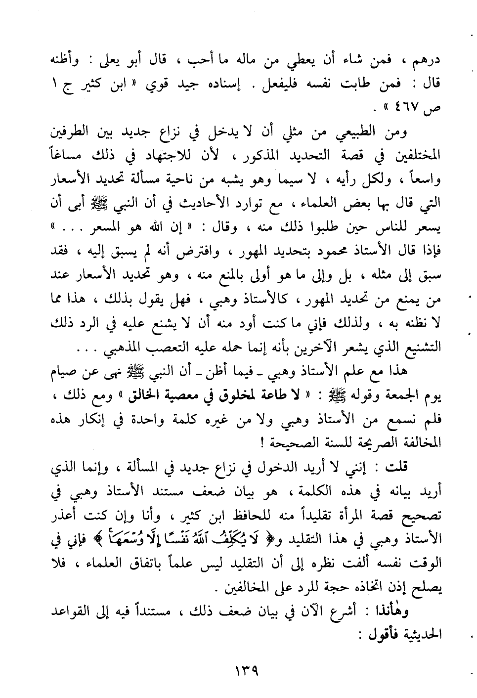 ومن الطبيعي من مثلي أن لا يدخل في نزاع جديد بين الطرفين المختلفين في قصة التحديد المذكور، لأن للاجتهاد في ذلك مساغاً واسعاً، ولكل رأيه، لا سيما وهو يشبه من ناحية مسألة تحديد الأسعار التي قال بها بعض العلماء، مع توارد الأحاديث في أن النبي -صلى الله عليه وسلم- أبى أن يسعر للناس حين طلبوا ذلك منه، وقال: " إن الله هو المسعر. . . " فإذا قال الأستاذ محمود بتحديد المهور، وافترض أنه لم يسبق إليه، فقد سبق إلى مثله، بل وإلى ما هو أولى بالمنع منه، وهو تحديد الأسعار عند من يمنع من تحديد المهور، كالأستاذ وهبي، فهل يقول بذلك، هذا ما لا نظنه به، ولذلك فإني ما كنت أود منه أن لا يشنع عليه في الرد ذلك التشنيع الذي يشعر الآخرين بأنه إنما حمله عليه التعصب المذهبي. . .