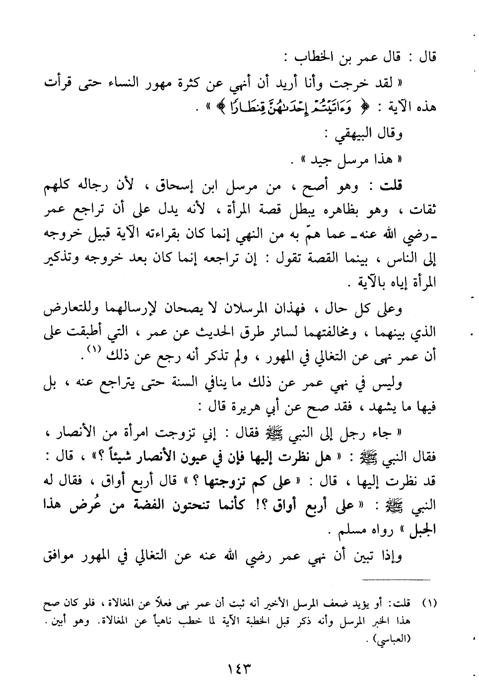 (¬1) قلت: أو يؤيد ضعف المرسل الأخير أنه ثبت أن عمر نهى فعلاً عن المغالاة، فلو كان صح هذا الخبر المرسل وأنه ذكر قبل الخطبة الآية لما خطب ناهياً عن المغالاة. وهو أبين. (العباسي)