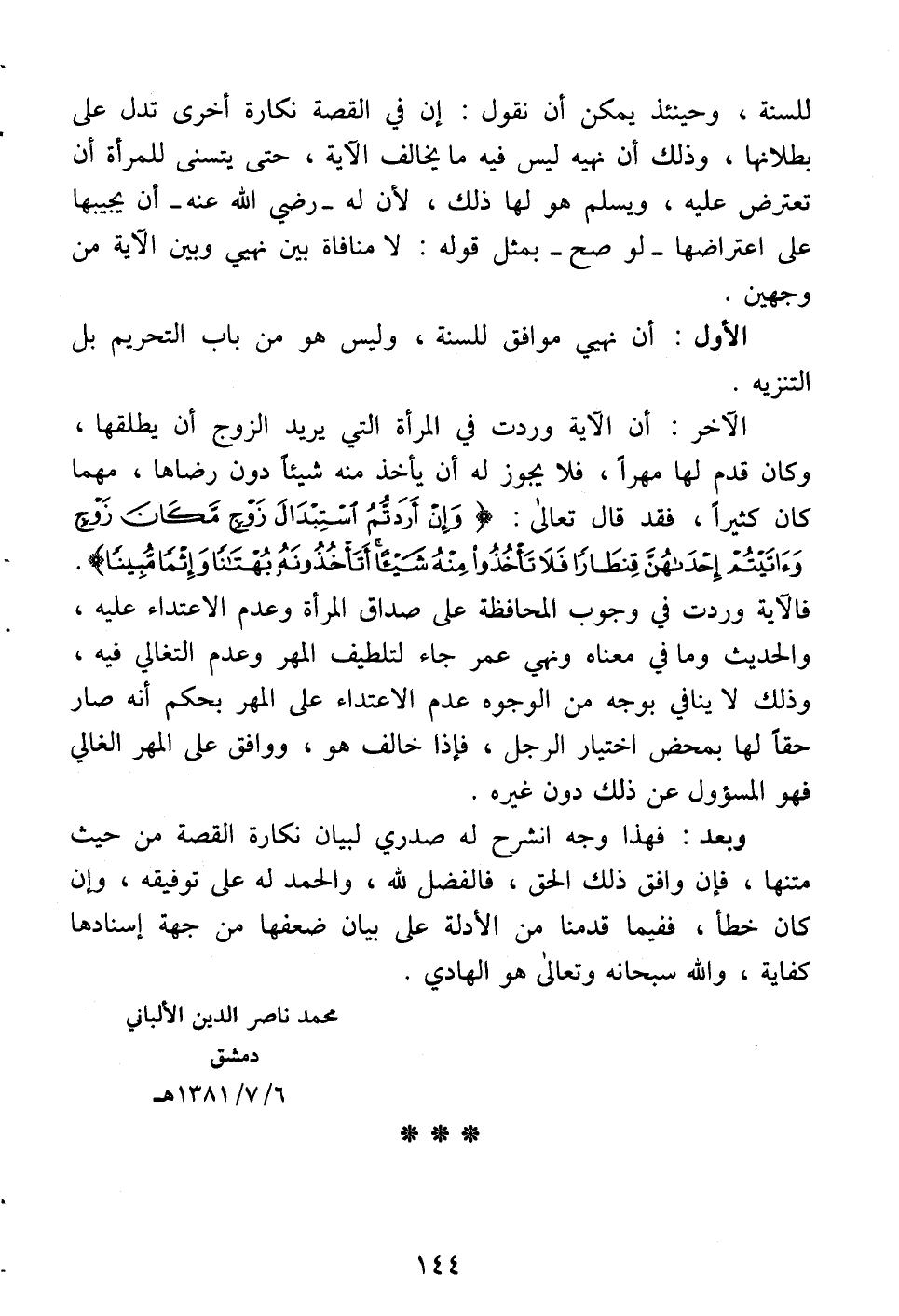 الآخر: أن الآية وردت في المرأة التي يريد الزوج أن يطلقها، وكان قدر لها مهراً، فلا يجوز له أن يأخذ منه شيئاً دون رضاها، مهما كان كثيراً، فقد قال تعالى: (وإن أردتم استبدال زوج مكان زوج وءاتيتم إحداهن قنطارا فلا تأخذوا منه شيئاً أتأخذونه بهتانا وإثما مبينا) فالآية وردت في وجوب المحافظة على صداق المرأة وعدم الاعتداء عليه، والحديث وما في معناه ونهي عمر جاء لتطيف المهر وعدم التغالي فيه، وذلك لا ينافي بوجه من الوجوه عدم الاعتداء على المهر بحكم أنه صار حقاً لها بمحض اختيار الرجل، فإذا خالف هو، ووافق على المهر الغالي فهو المسؤول عن ذلك دون غيره.