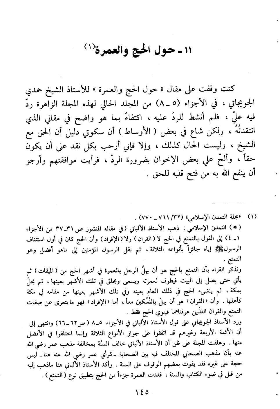 (*) التمدن الإسلامي: ذهب الأستاذ الألباني (في مقاله المنشور ص 71 - 37 من الأجزاء 1 - 4) إلى القول بالتمتع في الحج لا (القران) ولا (الإفراد) وأن الحج كان في أول استئناف الرسول -صلى الله عليه وسلم- إياه جائزاً بأنواعه الثلاثة، ثم نقل الرسول المؤمنين إلى ماهو أفضل وهو التمتع.