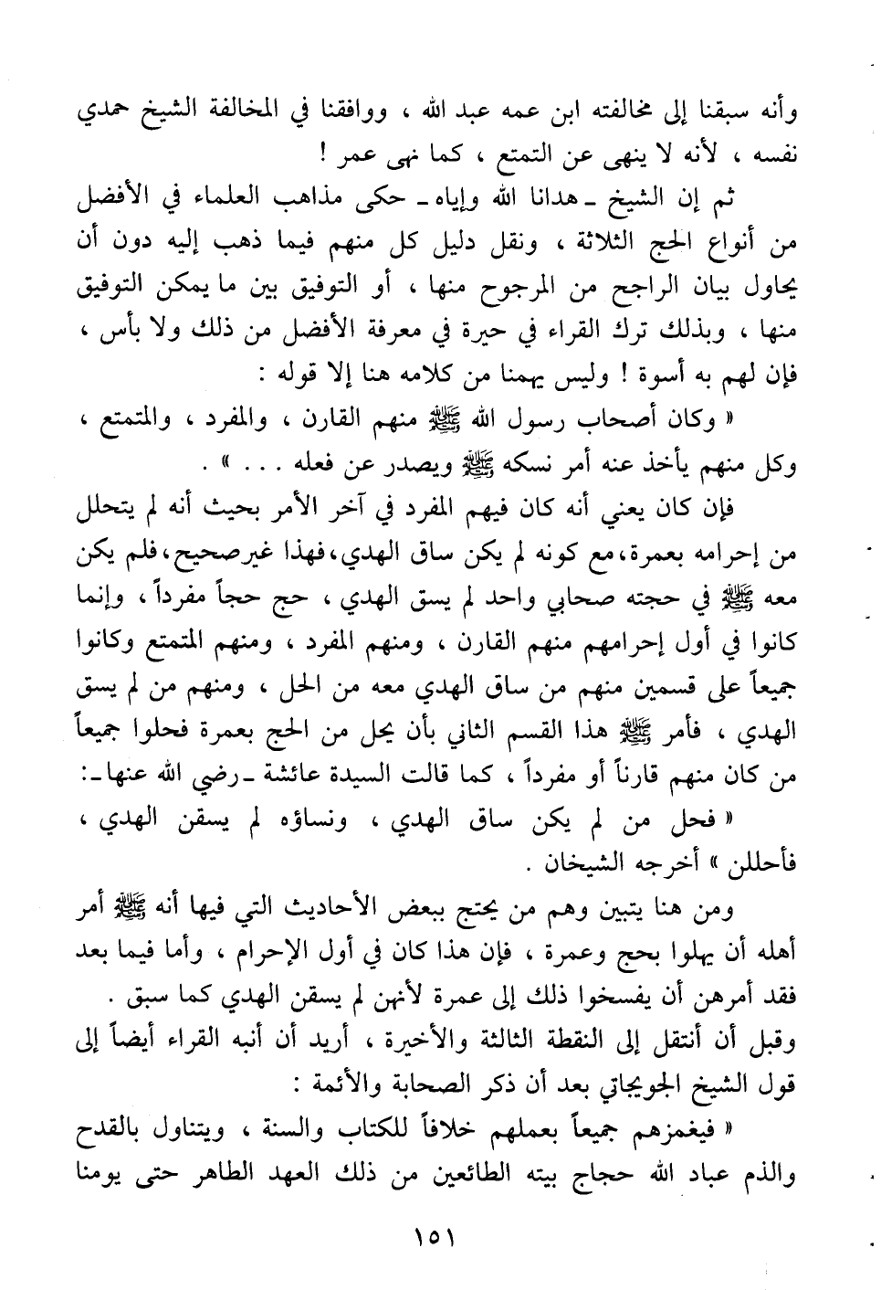 ثم إن الشيخ -هدانا الله وإياه- حكى مذاهب العلماء في الأفضل من أنواع الحج الثلاثة، ونقل دليل كل منهم فيما ذهب إليه دون أن يحاول بيان الراجح من المرجوح منها، أو التوفيق بين ما يمكن التوفيق منها، وبذلك ترك القراء في حيرة في معرفة الأفضل من ذلك ولا بأس، فإن لهم به أسوة! وليس يهمنا من كلامه هنا إلا قوله: