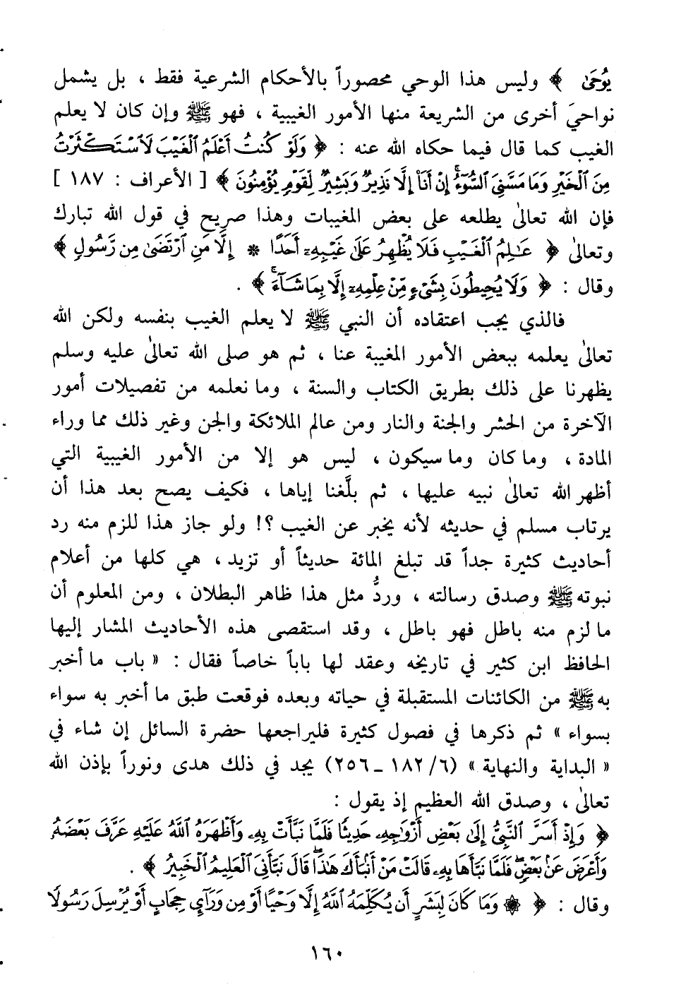 يوحى}، وليس هذا الوحى محصوراً بالأحكام الشرعية فقط، بل يشمل نواحي أخرى من الشريعه منها الأمور الغيبيه، فهو -صلى الله عليه وسلم- وإن كان لا يعلم الغيب كما قال فيما حكاه الله عنه: {ولو كنت أعلم الغيب لاستكثرت من الخير وما مسني السوء إن أنا إلا نذير وبشير لقوم يؤمنون} (الأعراف: 187) فإن الله تعالى يطلعه على بعض المغيبات وهذا صريح فى قول الله تبارك وتعالى {عالم الغيب فلا يظهر على غيبه أحدا * إلا من ارتضى من رسول} وقال: {ولا يحيطون بشيء من علمه إلا بما شاء}.