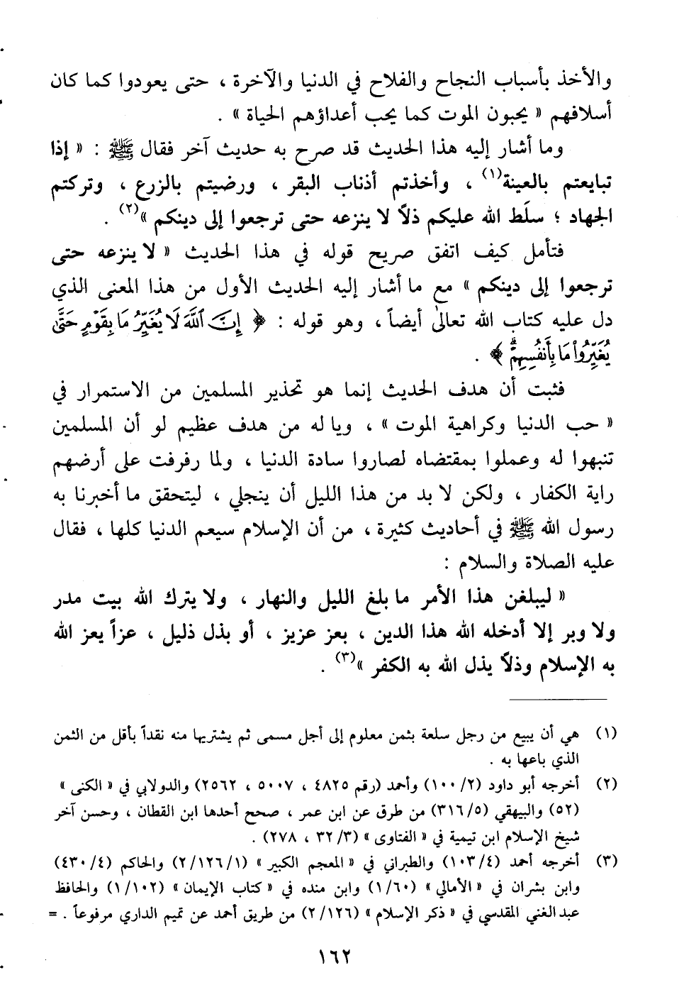 فتأمل كيف اتفق صريح قوله فى هذا الحديث " لا ينزعه حتى ترجعوا إلى دينكم " مع ما أشار إليه الحديث الأول من هذا المعنى الذى دل عليه كتاب الله تعالى أيضاً، وهو قوله: {إن الله لا يغير ما بقوم حتى يغيروا ما بأنفسهم}.