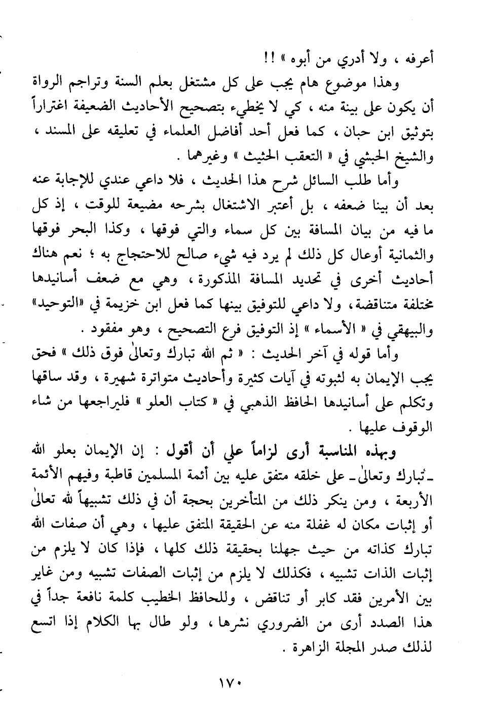 وبهذه المناسبة أرى لزاماً علي أن أقول: إن الإيمان بعلو الله -تبارك وتعالى- على خلقه متفق عليه بين أئمة المسلمين قاطبة وفيهم الأئمة الأربعة، ومن ينكر ذلك من المتأخرين بحجة أن في ذلك تشبيهاً لله تعالى أو إثبات مكان له غفلة منه عن الحقيقة المتفق عليها، وهي أن صفات الله تبارك كذاته من حيث جهلنا بحقيقة ذلك كلها، فإذا كان لا يلزم من إثبات الذات تشبيه، فكذلك لا يلزم من إثبات الصفات تشبيه ومن غاير بين الأمرين فقد كابر أو تناقض، وللحافظ الخطيب كلمة نافعة جداً في هذا الصدد أرى من الضروري نشرها، ولو طال بها الكلام إذا اتسع لذلك صدر المجلة الزاهرة.