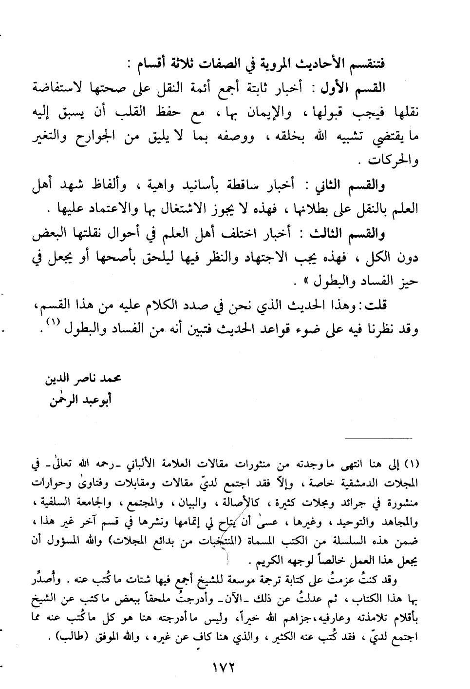 القسم الأول: أخبار ثابتة أجمع أئمة النقل على صحتها لاستفاضة نقلها فيجب قبولها، والإيمان بها، مع حفظ القلب أن يسبق إليه ما يقتضي تشبيه الله بخلقه، ووصفه بما لا يليق من الجوارح والتغير والحركات.