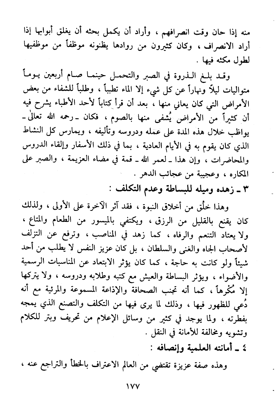 وقد بلغ الذروة في الصبر والتحمل حينما صام أربعين يوماً متواليات ليلاً ونهاراً عن كل شيء إلا الماء تطبباً، وطلباً للشفاء من بعض الأمراض التي كان يعاني منها، بعد أن قرأ كتاباً لأحد الأطباء يشرح فيه أن كثيراً من الأمراض يشفى منها بالصوم، فكان -رحمه الله تعالى- يواظب خلال هذه المدة على عمله ودروسه وتأليفه، ويمارس كل النشاط الذي كان يقوم به في الأيام العادية، بما في ذلك الأسفار وإلقاء الدروس والمحاضرات، وإن هذا -لعمر الله- قمة في مضاء العزيمة، والصبر على المكاره، وعجيبة من عجائب الدهر.