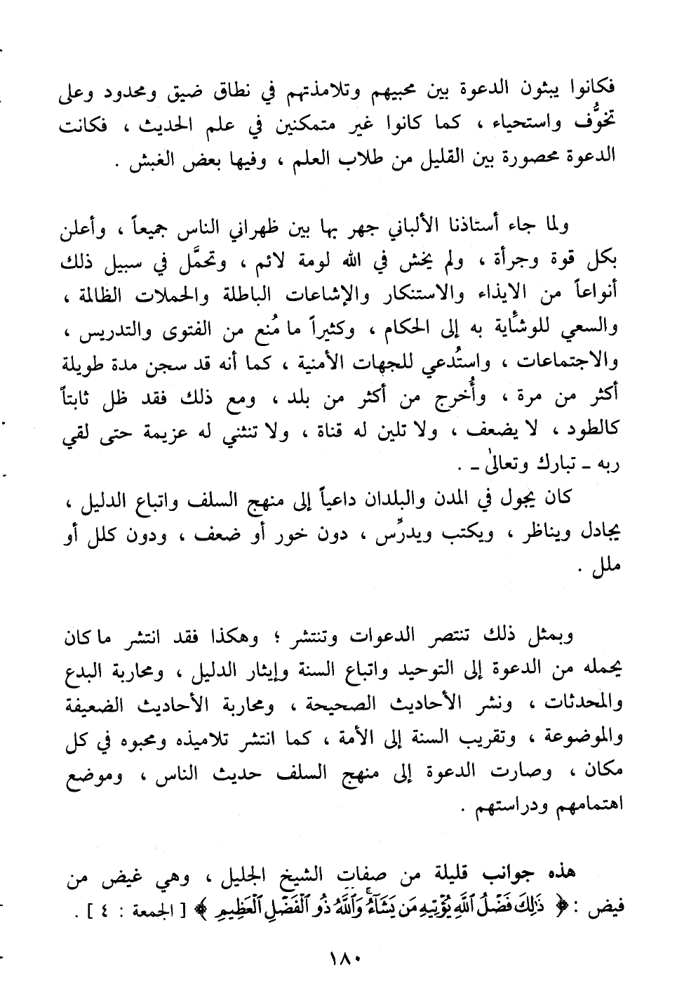 ولما جاء أستاذنا الألباني جهر بها بين ظهراني الناس جميعاً، وأعلن بكل قوة وجرأة، ولم يخشى في الله لومة لائم، وتحمل في سبيل ذلك أنواعاً من الايذاء والاستنكار والإشاعات الباطلة والحملات الظالمة، والسعي للوشاية به إلى الحكام، وكثيراً ما منع من الفتوى والتدريس، والاجتماعات، واستدعي للجهات الأمنية، كما أنه قد سجن مدة طويلة أكثر من مرة، وأخرج من أكثر من بلد، ومع ذلك فقد ظل ثابتاً كالطود، لا يضعف، ولا تلين له قناة، ولا تنثني له عزيمة حتى لقي ربه -تبارك وتعالى-.