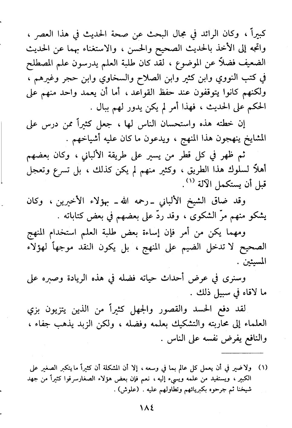 كبيراً، وكان الرائد في مجال البحث عن صحة الحديث في هذا العصر، واتجه إلى الأخذ بالحديث الصحيح والحسن، والاستغناء بهما عن الحديث الضعيف فضلاً عن الموضوع، لقد كان طلبة العلم يدرسون علم المصطلح في كتب النووي وابن كثير وابن الصلاح والسخاوي وابن حجر وغيرهم، ولكنهم كانوا يتوقفون عند حفظ القواعد، أما أن يعمد واحد منهم على الحكم على الحديث، فهذا أمر لم يكن يدور لهم ببال.