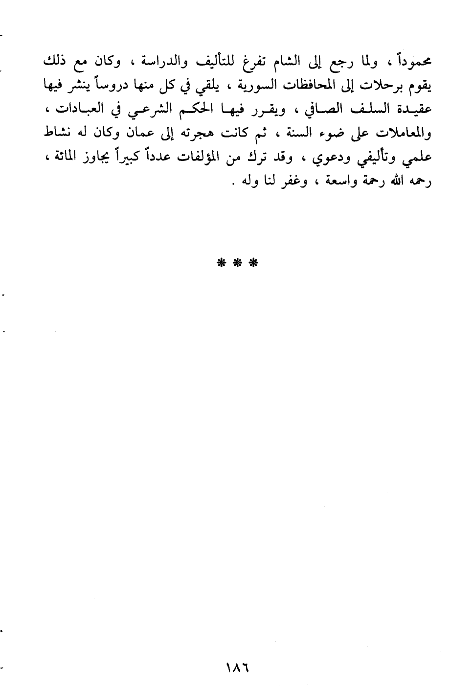 محموداً، ولما رجع إلى الشام تفرغ للتأليف والدراسة، وكان مع ذلك يقوم برحلات إلى المحافظات السورية، يلقي في كل منها دروساً ينشر فيها عقيدة السلف الصافي، ويقرر فيها الحكم الشرعي في العبادات، والمعاملات على ضوء السنة، ثم كانت هجرته إلى عمان وكان له نشاط علمي وتأليفي ودعوي، وقد ترك من المؤلفات عدداً كبيراً يجاوز المائة، رحمه الله رحمة واسعة، وغفر لنا وله.