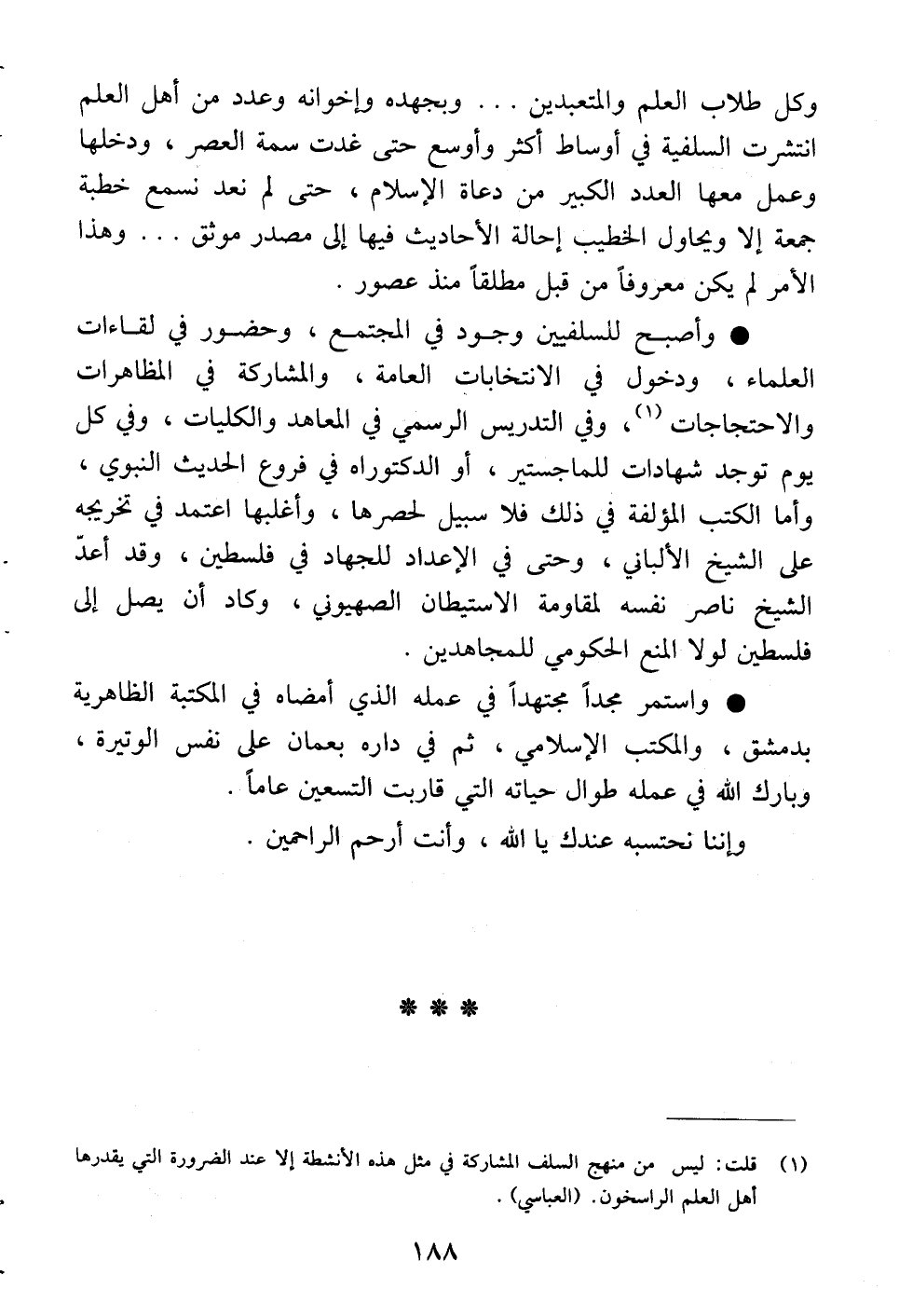 وكل طلاب العلم والمتعبدين. . . وبجهده وإخوانه وعدد من أهل العلم انتشرت السلفية في أوساط أكثر وأوسع حتى غدت سمة العصر، ودخلها وعمل معها العدد الكبير من دعاة الإسلام، حتى لم نعد نسمع خطبة جمعة إلا ويحاول الخطيب إحالة الأحاديث فيها إلى مصدر موثق. . . وهذا الأمر لم يكن معروفاً من قبل مطلقاً منذ عصور.