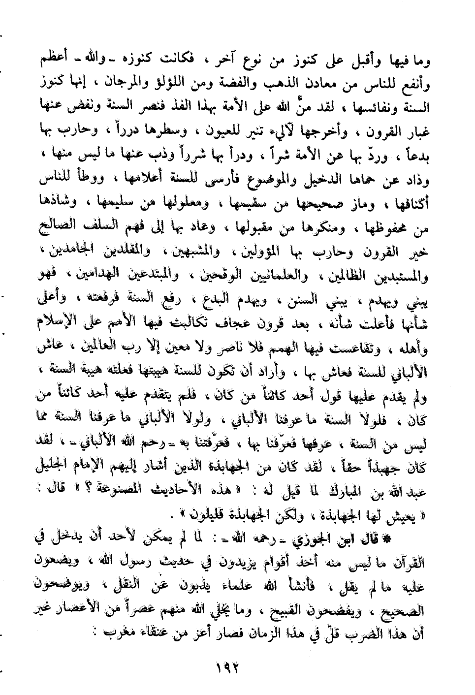 وما فيها وأقبل على كنوز من نوع آخر، فكانت كنوزه -والله- أعظم وأنفع للناس من معادن الذهب والفضة ومن اللؤلؤ والمرجان، إنها كنوز السنة ونفائسها، لقد من الله على الأمة بهذا الفذ فنصر السنة ونفض عنها غبار القرون، وأخرجها لآليء تنير للعيون، وسطرها درراً، وحارب بها بدعاً، ورد بها عن الأمة شراً، ودرأ بها شرراً وذب عنها ما ليس منها، وذاد عن حماها الدخيل والموضوع فأرسى للسنة أعلامها، ووطأ للناس أكنافها، وماز صحيحها من سقيمها، ومعلولها من سليمها، وشاذها من محفوظها، ومنكرها من مقبولها، وعاد بها إلى فهم السلف الصالح خير القرون وحارب بها المؤولين، والمشبهين، والمقلدين الجامدين، والمستبدين الظالمين، والعلمانيين الوقحين، والمبتدعين الهدامين، فهو يبني ويهدم، يبني السنن، ويهدم البدع، رفع السنة فرفعته، وأعلى شأنها فأعلت شأنه، بعد قرون عجاف تكالبت فيها الأمم على الإسلام وأهله، وتقاعست فيها الهمم فلا ناصر ولا معين إلا رب العالمين، عاش الألباني للسنة فعاش بها، وأراد أن تكون للسنة هيبتها فعلته هيبة السنة، ولم يقدم عليها قول أحد كائناً من كان، فلم يتقدم عليه أحد كائناً من كان، فلولا السنة ما عرفنا الألباني، ولولا الألباني ما عرفنا السنة مما ليس من السنة، عرفها فعرفنا بها، فعرفتنا به -رحم الله الألباني-، لقد كان جهبذاً حقاً، لقد كان من الجهابذة الذين أشار إليهم الإمام الجليل عبد الله بن المبارك لما قيل له: " هذه الأحاديث المصنوعة؟ " قال: " يعيش لها الجهابذة، ولكن الجهابذة قليلون ".