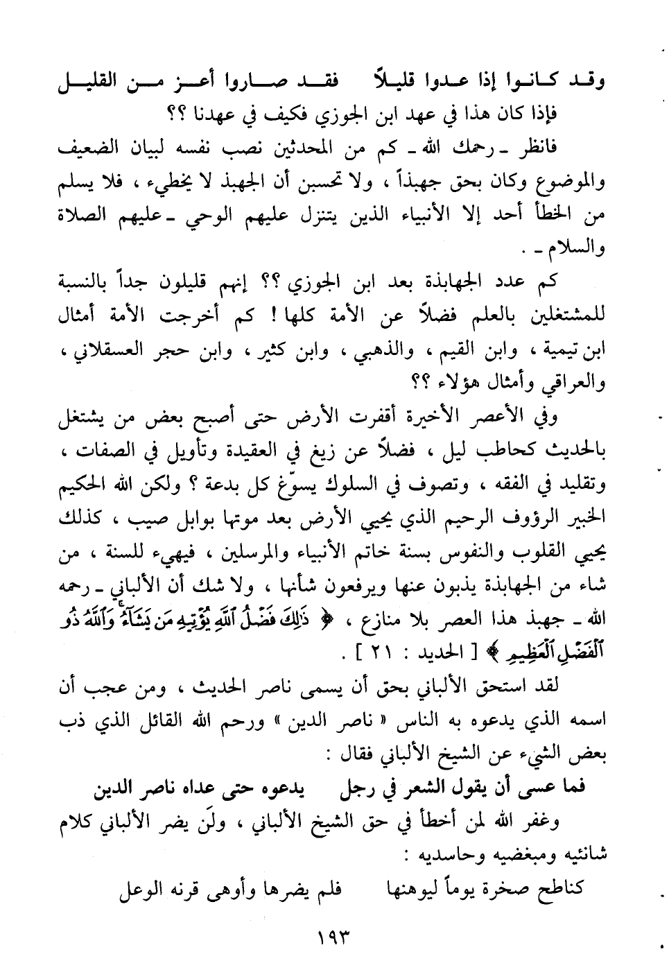 وفي الأعصر الأخيرة أقفرت الأرض حتى أصبح بعض من يشتغل بالحديث كحاطب ليل، فضلاً عن زيغ في العقيدة وتأويل في الصفات، وتقليد في الفقه، وتصوف في السلوك يسوغ كل بدعة؟ ولكن الله الحكيم الخبير الرؤوف الرحيم الذي يحيي الأرض بعد موتها بوابل صيب، كذلك يحي القلوب والنفوس بسنة خاتم الأنبياء والمرسلين، فيهيء للسنة، من شاء من الجهابذة يذبون عنها ويرفعون شأنها، ولا شك أن الألباني -رحمه الله- جهبذ هذا العصر بلا منازع، {ذلك فضل الله يؤتيه من يشاء والله ذو الفضل العظيم} [الحديد: 21].