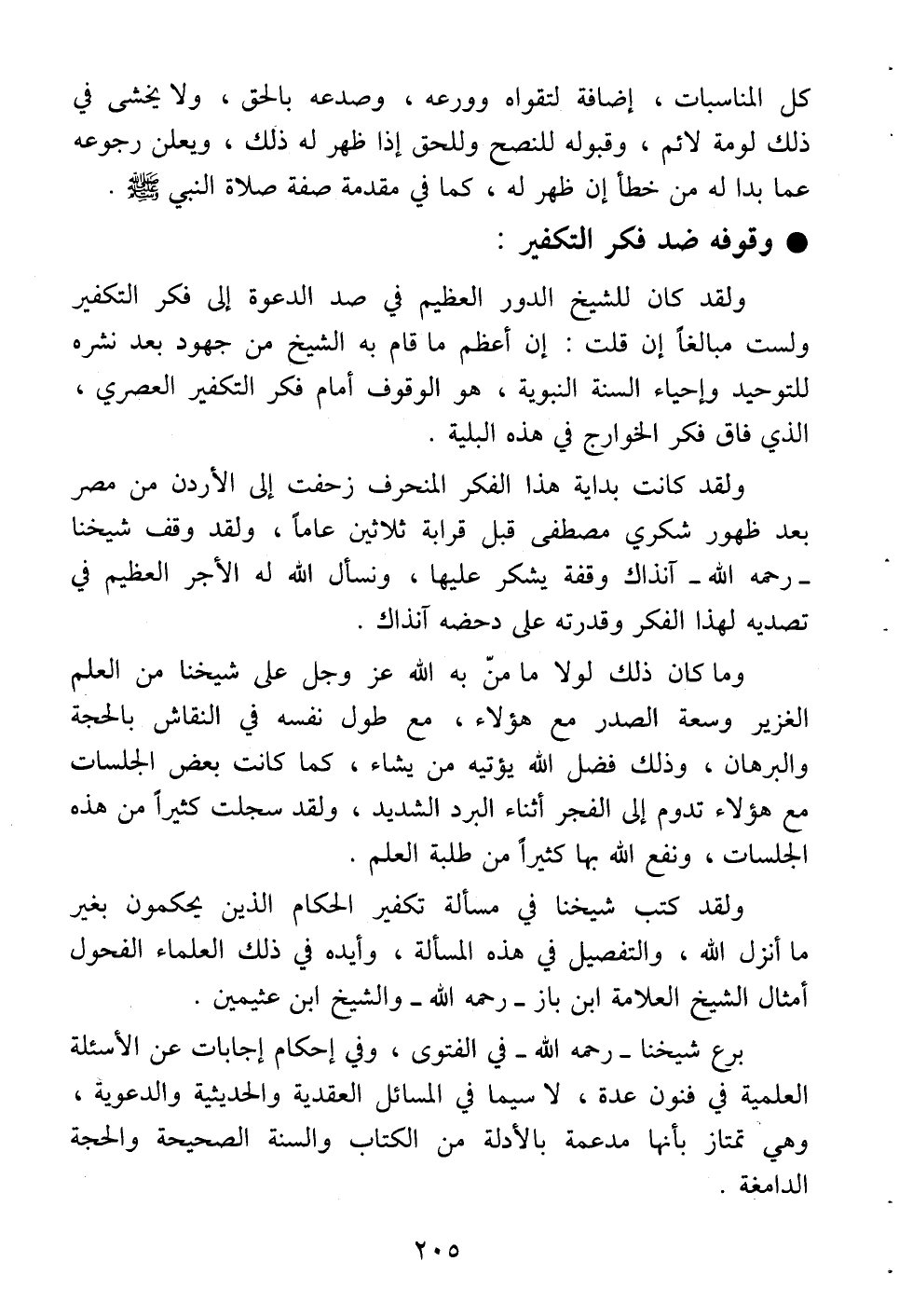 ولقد كان للشيخ الدور العظيم في صد الدعوة إلى فكر التكفير ولست مبالغاً إن قلت: إن أعظم ما قام به الشيخ من جهود بعد نشره للتوحيد وإحياء السنة النبوية، هو الوقوف أمام فكر التكفير العصري، الذي فاق فكر الخوارج في هذه البلية.