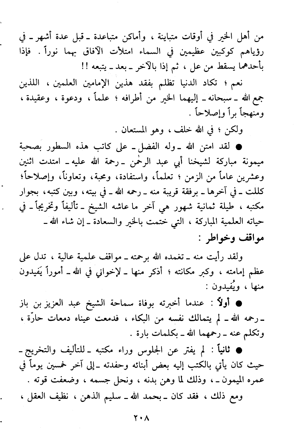 ولقد رأيت منه -تغمده الله برحمته- مواقف علمية عالية، تدل على عظم إمامته، وكبر مكانته، أذكر منها -لإخواني في الله- أموراً يَفيدون منها، ويُفيدون: