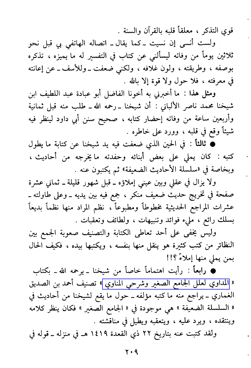 • رابعاً: رأيت اهتماماً خاصاً من شيخنا -يرحمه الله- بكتاب " المداوي لعلل الجامع الصغير وشرحي المناوي " تصنيف أحمد بن الصديق الغماري -يراجع منه ما كتبه مؤلفه- حول ما يقع لشيخنا من أحاديث في " السلسلة الضعيفة " هي موجودة في " الجامع الصغير " فكان ينظر كلامه وينتقده، ويرد عليه، ويتعقبه ويطيل في مناقشته.