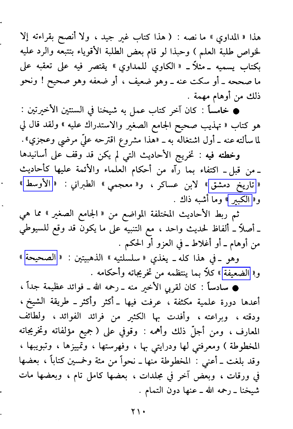 • خامساً: كان آخر كتاب عمل به شيخنا في السنتين الأخيرتين: هو كتاب " تهذيب صحيح الجامع الصغير والاستدراك عليه " ولقد قال لي لما سألته عنه -أول اشتغاله به- " هذا مشروع اقترحه علي مرضي وعجزي ".