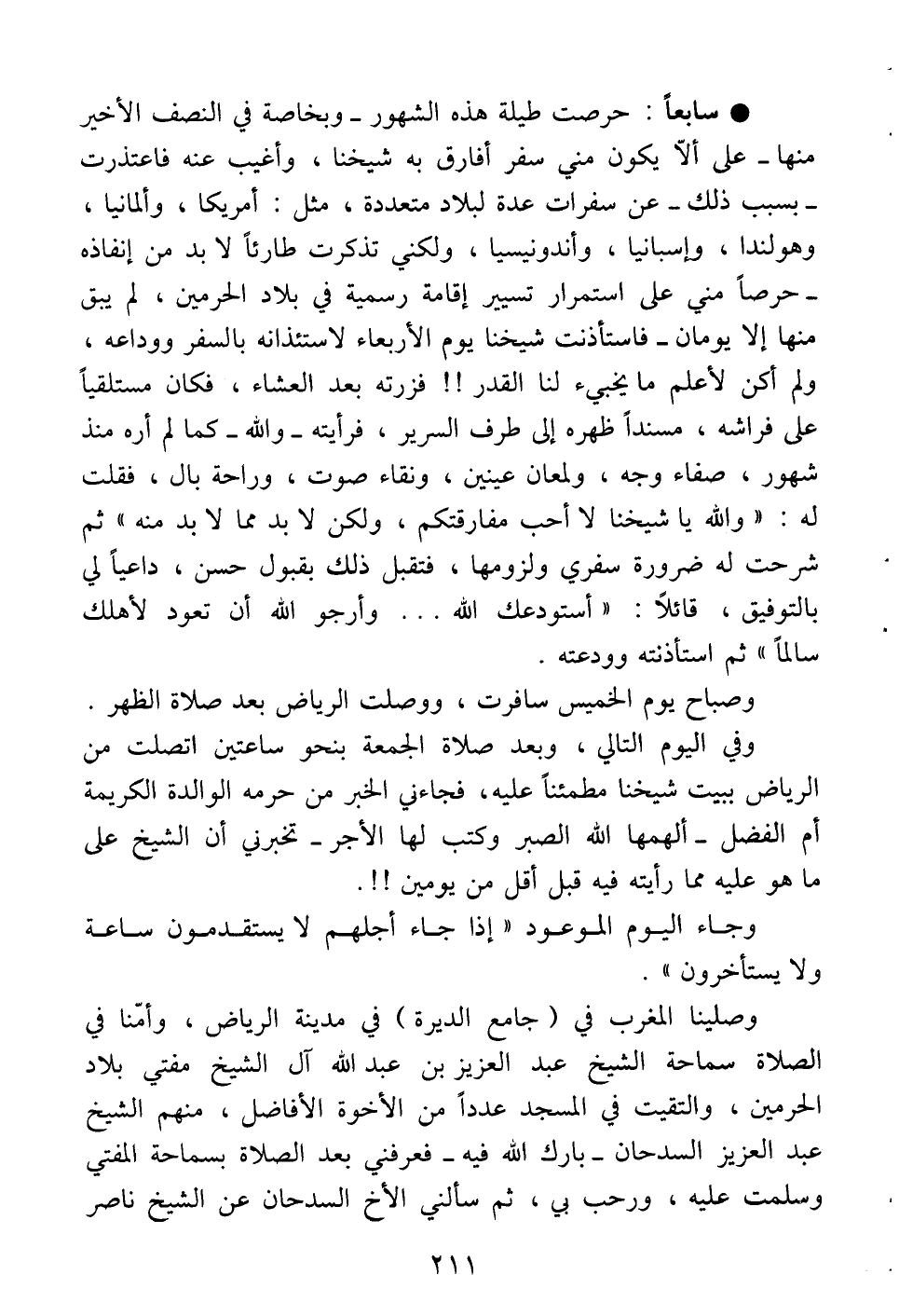 • سابعاً: حرصت طيلة هذه الشهور -وبخاصة في النصف الأخير منها- على ألا يكون مني سفر أفارق به شيخنا، وأغيب عنه فاعتذرت بسبب ذلك عن سفرات عدة لبلاد متعددة، مثل: أمريكا، وألمانيا، وهولندا، وإسبانيا، وأندونيسيا، ولكني تذكرت طارئاً لابد من إنفاذه حرصاً مني على استمرار تسيير إقامة رسمية في بلاد الحرمين، لم يبق منها إلا يومان - فاستأذنت شيخنا يوم الأربعاء لاستئذانه بالسفر ووداعه، ولم أكن لأعلم ما يخبيء لنا القدر!! فزرته بعد العشاء، فكان مستلقياً على فراشه، مسنداً ظهره إلى طرف السرير، فرأيته -والله- كما لم أره منذ شهور، صفاء وجه، ولمعان عينين، ونقاء صوت، وراحة بال، فقلت له: " والله يا شيخنا لا أحب مفارقتكم، ولكن لا بد مما لا بد منه " ثم شرحت له ضرورة سفري ولزومها، فتقبل ذلك بقبول حسن، داعياً لي بالتوفيق، قائلاً: " أستودعك الله. . . وأرجو الله أن تعود لأهلك سالماً " ثم استأذنته وودعته.