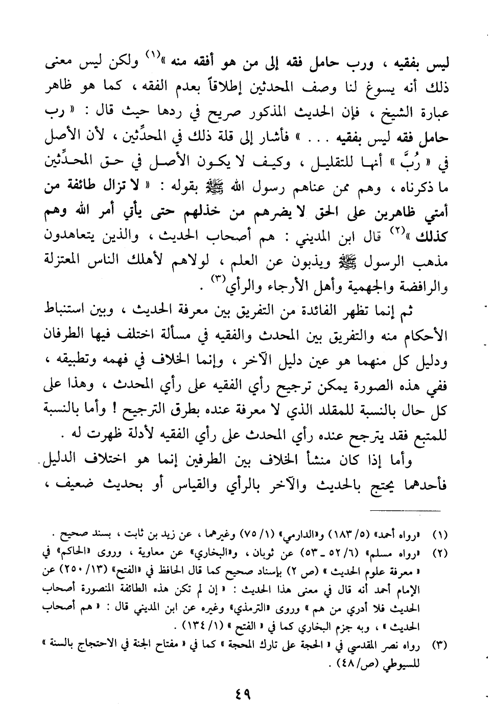 ليس بفقيه، ورب حامل فقه إلى من هو أفقه منه " (¬1) ولكن ليس معنى ذلك أنه يسوغ لنا وصف المحدثين إطلاقاً بعدم الفقه، كما هو ظاهر عبارة الشيخ، فإن الحديث المذكور صريح في ردها حيث قال: " رب حامل فقه ليس بفقيه. . . " فأشار إلى قلة ذلك في المحدثين، لأن الأصل في " رب " أنها للتقليل، وكيف لا يكون الأصل في حق المحدثين ما ذكرناه، وهم ممن عاهم رسول الله -صلى الله عليه وسلم- بقوله: " لا تزال طائفة من أمتي ظاهرين على الحق لا يضرهم من خذلهم حتى يأتي أمر الله وهم كذلك " (¬2) قال ابن المديني: هم أصحاب الحديث، والذين يتعاهدون مذهب الرسول -صلى الله عليه وسلم- ويذبون عن العلم، لولاهم لأهلك الناس المعتزلة والرافضة والجهمية وأهل الأرجاء والرأي (¬3).