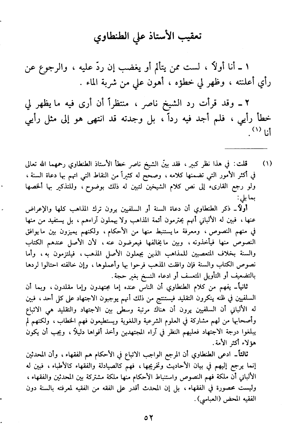 (¬1) قلت: في هذا نظر كبير، فقد بين الشيخ ناصر خطأ الأستاذ الطنطاوي رحمهما الله تعالى في أكثر الأمور التي تضمنها كلامه، وصحح له كثيراً من النقاط التي اتهم بها دعاة السنة، ولو رجع القارئ إلى نص كلام الشيخين لتبين له ذلك بوضوح، وللتذكير بها ألخصها بما يلي: