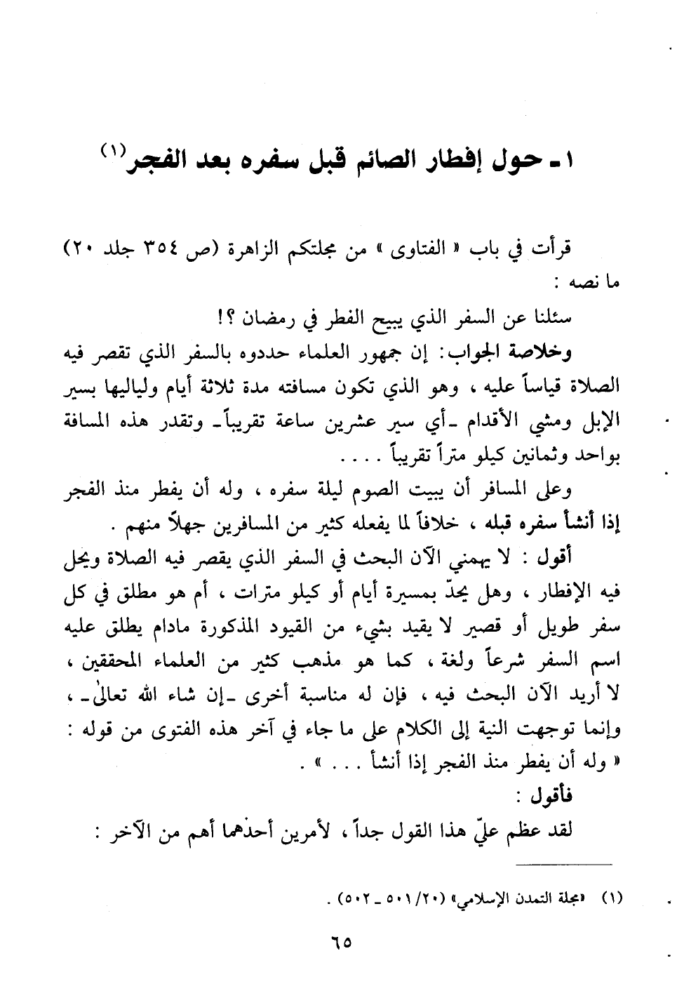 أقول: لا يهمني الآن البحث في السفر الذي يقصر فيه الصلاة ويحل فيه الإفطار، وهل يحد بمسيرة أيام أو كيلو مترات، أم هو مطلق في كل سفر طويل أو قصير لا يقيد بشيء من القيود المذكورة مادام يطلق عليه اسم السفر شرعاً ولغة، كما هو مذهب كثير من العلماء المحققين، لا أريد الآن البحث فيه، فإن له مناسبة أخرى -إن شاء الله تعالى، وإنما توجهت النية إلى الكلام على ما جاء في آخر هذه الفتوى من قوله: " وله أن يفطر منذ الفجر إذا أنشأ. . . ".