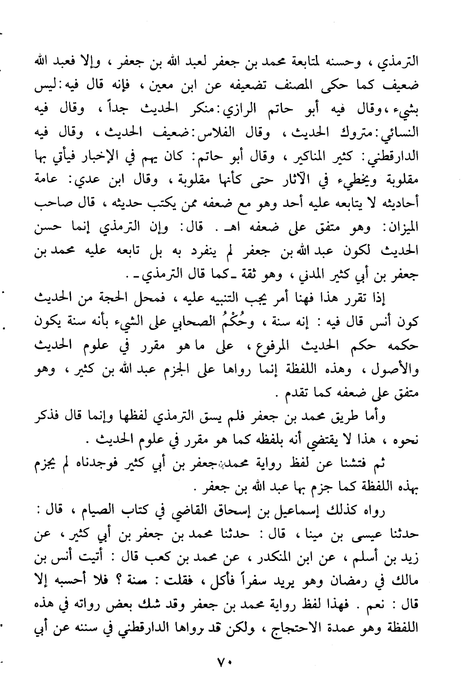 رواه كذلك إسماعيل بن إسحق القاضي في كتاب «الصيام»، قال: حدثنا عيسى بن مينا قال: حدثنا محمد بن جعفر بن أبي كثير عن زيد بن أسلم عن ابن المنكدر عن محمد بن كعب قال: أتيت أنس بن مالك في رمضان وهو يريد سفراً فأكل فقلت: سنّة؟ فلا أحسبه إلا قال: نعم. فهذا لفظ رواية محمد بن جعفر وقد شك بعض رواته في هذه اللفظة وهو عمدة الاحتجاج ولكن قد رواها الدارقطني في سننه عن أبي