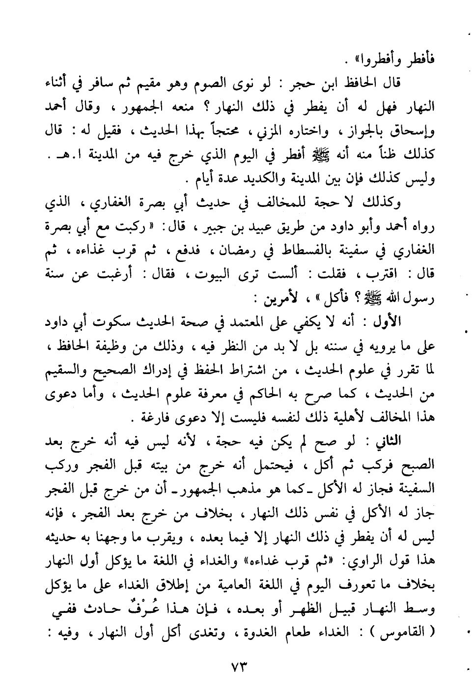 الثاني: لو صح لم يكن فيه حجة لأنه ليس فيه أنه خرج بعد الصبح فركب ثم أكل، فيحتمل أنه خرج من بيته قبل الفجر وركب السفينة فجاز له الأكل كما هو مذهب الجمهور أن من خرج قبل الفجر جاز له الأكل في نفس ذلك النهار بخلاف من خرج بعد الفجر فإنه ليس له أن يفطر في ذلك النهار إلا فيما بعده، ويقرب ما وجهنا به حديثه هذا قول الراوي ثم قرب غداءه والغداء في اللغة ما يؤكل أول النهار بخلاف ما تعورف اليوم في اللغة العامية من إطلاق الغداء على ما يؤكل وسط النهار قبيل الظهر أو بعده، فإن هذا عرف حادث ففي «القاموس»: الغداء طعام الغدوة وتغدى أكل أول النهار، وفيه: