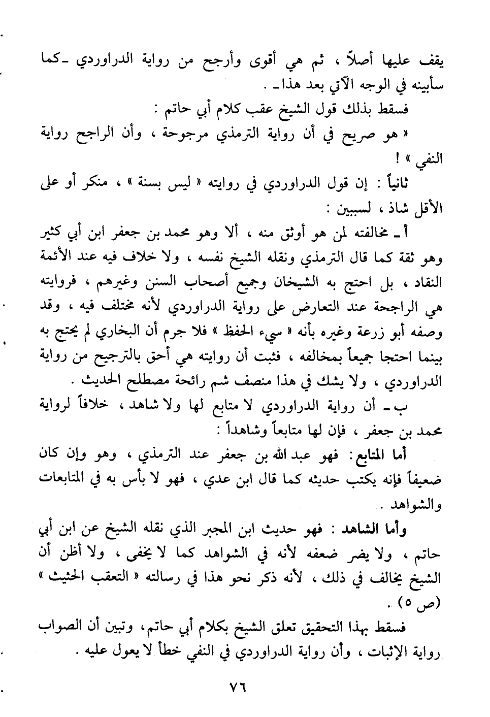 أ - مخالفته لمن هو أوثق منه، ألا وهو محمد بن جعفر بن أبي كثير وهو ثقة كما قال الترمذي ونقله عنه الشيخ نفسه، ولا خلاف فيه عند الأئمة النقاد، بل احتج به الشيخان وجميع أصحاب السنن وغيرهم، فروايته هي الراجحة عند التعارض على رواية الدراوردي لأنه مختلف فيه، وقد وصفه أبو زرعة وغيره بأنه «سيئ الحفظ» فلا جرم أن البخاري لم يحتج به بينما احتجا جميعاً بمخالفه، فثبت أن روايته هي أحق بالترجيح من رواية الدراوردي، ولا يشك في هذا منصف شم رائحة مصطلح الحديث.