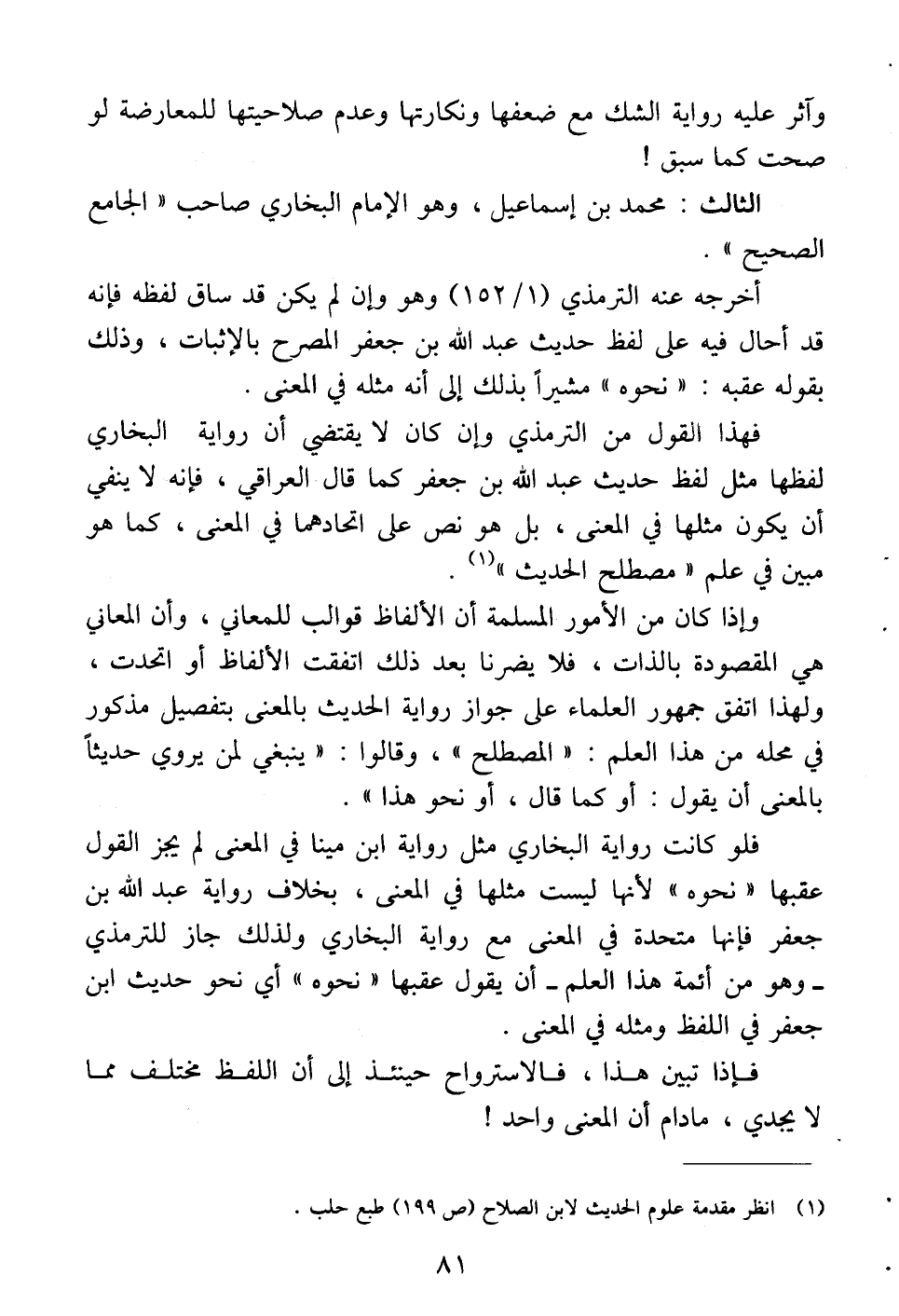 فلو كانت رواية البخاري مثل رواية ابن مينا في المعنى لم يجز القول عقبها «نحوه» لأنها ليست مثلها في المعنى، بخلاف رواية عبد الله بن جعفر فإنها متحدة في المعنى مع رواية البخاري ولذلك جاز للترمذي - وهو من أئمة هذا العلم - أن يقول عقبها «نحوه» أي نحو حديث ابن جعفر في اللفظ ومثله في المعنى.