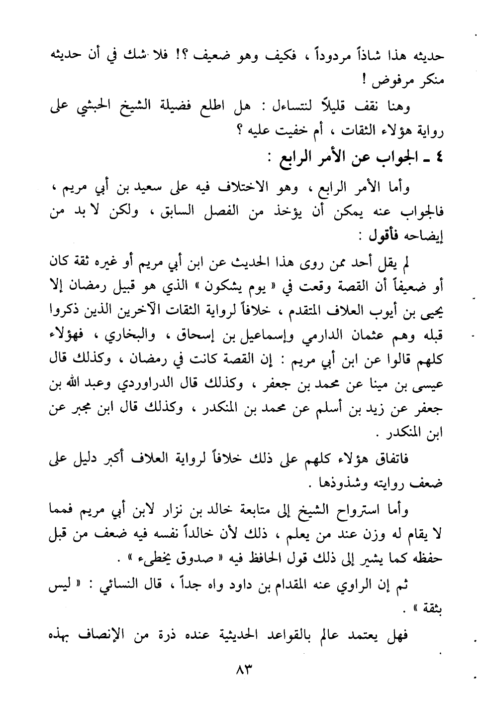 وأما الأمر الرابع، وهو الاختلاف فيه على سعيد بن أبي مريم، فالجواب عنه يمكن أن يؤخذ من الفصل السابق، ولكن لا بد من إيضاحه فأقول: