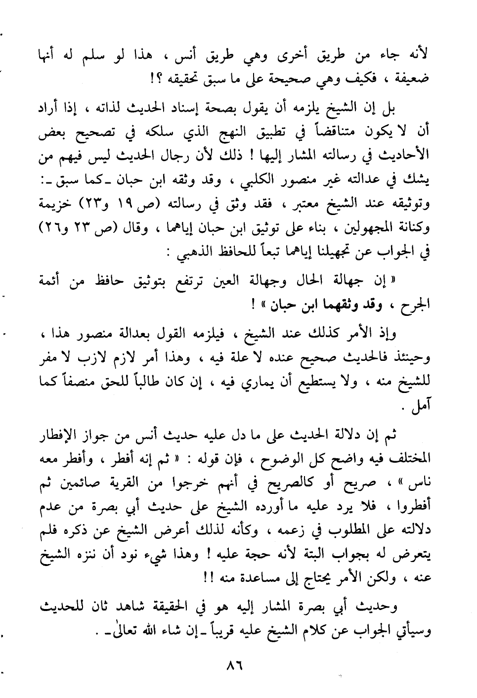بل إن الشيخ يلزمه أن يقول بصحة إسناد الحديث لذاته، إذا أراد أن لا يكون متناقضاً في تطبيق النهج الذي سلكه في تصحيح بعض الأحاديث في رسالته المشار إليها! ذلك لأن الحديث ليس فيهم من يشك في عدالته غير منصور الكلبي، وقد وثقه ابن حبان، كما سبق وتوثيقه عند الشيخ معتبر، فقد وثق في رسالته (ص 19 و 23) خزيمة وكنانة المجهولين، بناء على توثيق ابن حبان إياهما، وقال (ص 23 و 26) في الجواب عن تجهيلنا إياهما تبعاً للحافظ الذهبي: