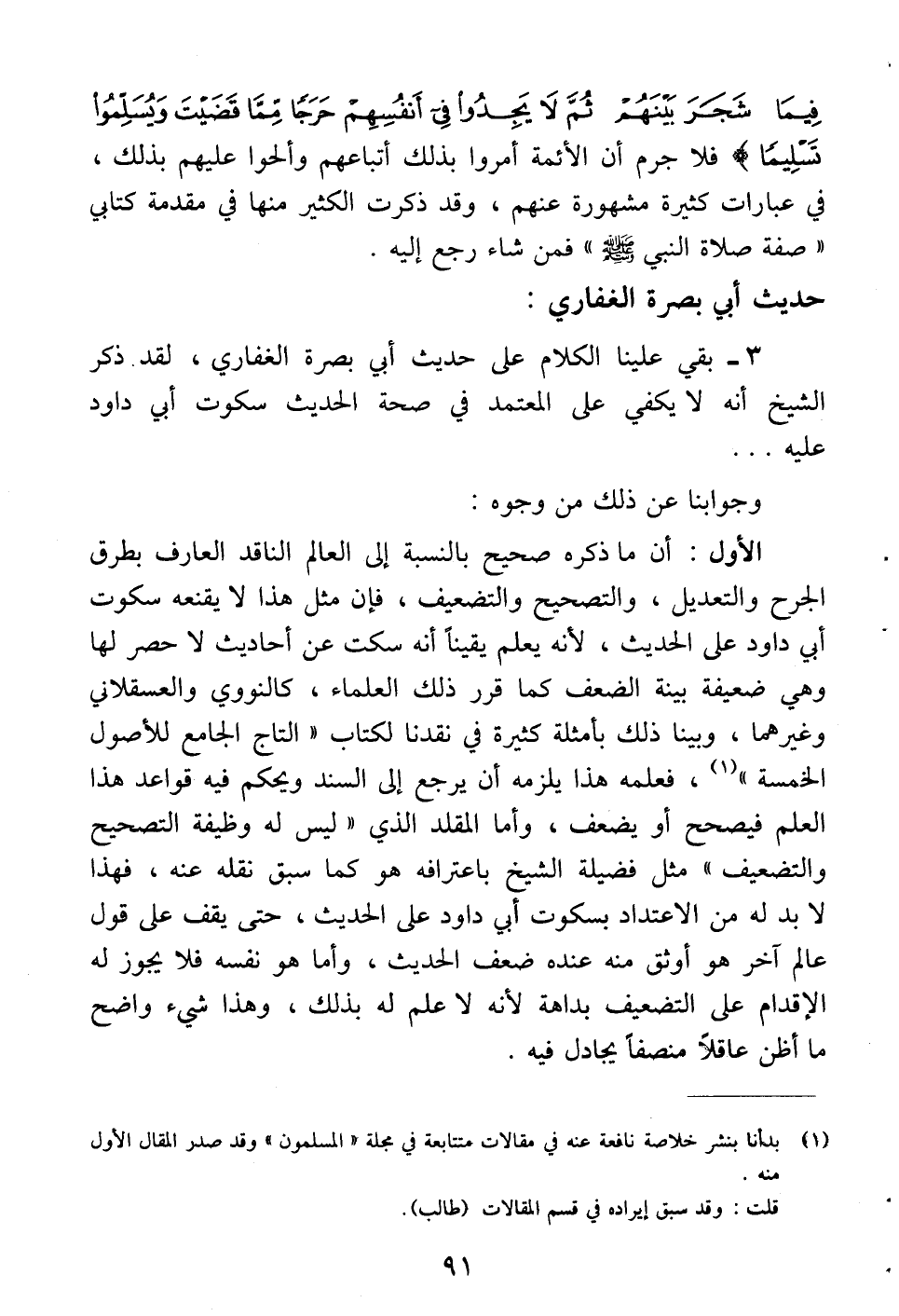 الأول: أن ما ذكره صحيح بالنسبة إلى العالم الناقد العارف بطرق الجرح والتعديل، والتصحيح والتضعيف، فإن مثل هذا لا يقنعه سكوت أبي داود على الحديث، لأنه يعلم يقيناً أنه سكت عن أحاديث لا حصر لها وهي ضعيفة بينة الضعف كما قرر ذلك العلماء، كالنووي والعسقلاني وغيرهما، وبينا ذلك بأمثلة كثيرة في نقدنا لكتاب «التاج الجامع للأصول الخمسة» (¬1)، فعلمه هذا يلزمه أن يرجع إلى السند ويحكم فيه قواعد هذا العلم فيصحح أو يضعف، وأما المقلد الذي «ليس له وظيفة التصحيح والتضعيف» مثل فضيلة الشيخ باعترافه هو كما سبق نقله عنه، فهذا لا بد له من الاعتداد بسكوت أبي داود على الحديث حتى يقف على قول عالم آخر هو أوثق منه عنده ضَعَّف الحديث، وأما هو نفسه فلا يجوز له الإقدام على التضعيف بداهة لأنه لا علم له بذلك، وهذا شيء واضح ما أظن عاقلاً منصفاً يجادل فيه.