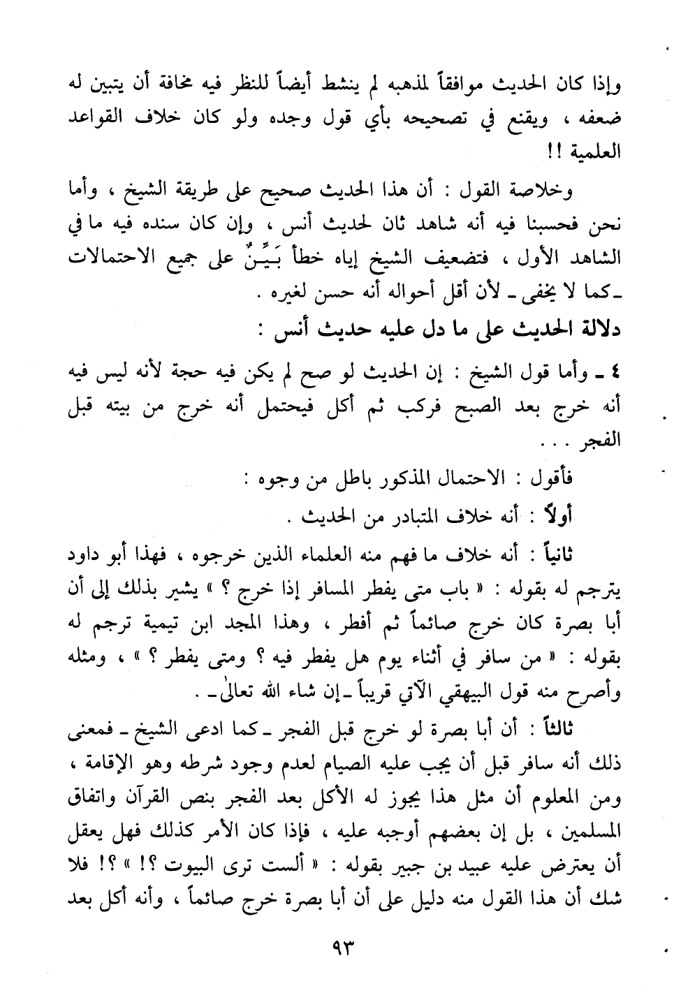 ثالثاً: أن أبا بصرة لو خرج قبل الفجر - كما ادعى الشيخ - فمعنى ذلك أنه سافر قبل أن يجب عليه الصيام لعدم وجود شرطه وهو الإقامة، ومن المعلوم أن مثل هذا يجوز له الأكل بعد الفجر بنص القرآن واتفاق المسلمين، بل إن بعضهم أوجبه عليه، فإذ الأمر كذلك فهل يعقل أن يعترض عليه عبيد بن جبير بقول: «ألست ترى البيوت؟!»، فلا شك أن هذا القول منه دليل على أن أبا بصرة خرج صائماً، وأنه أكل بعد