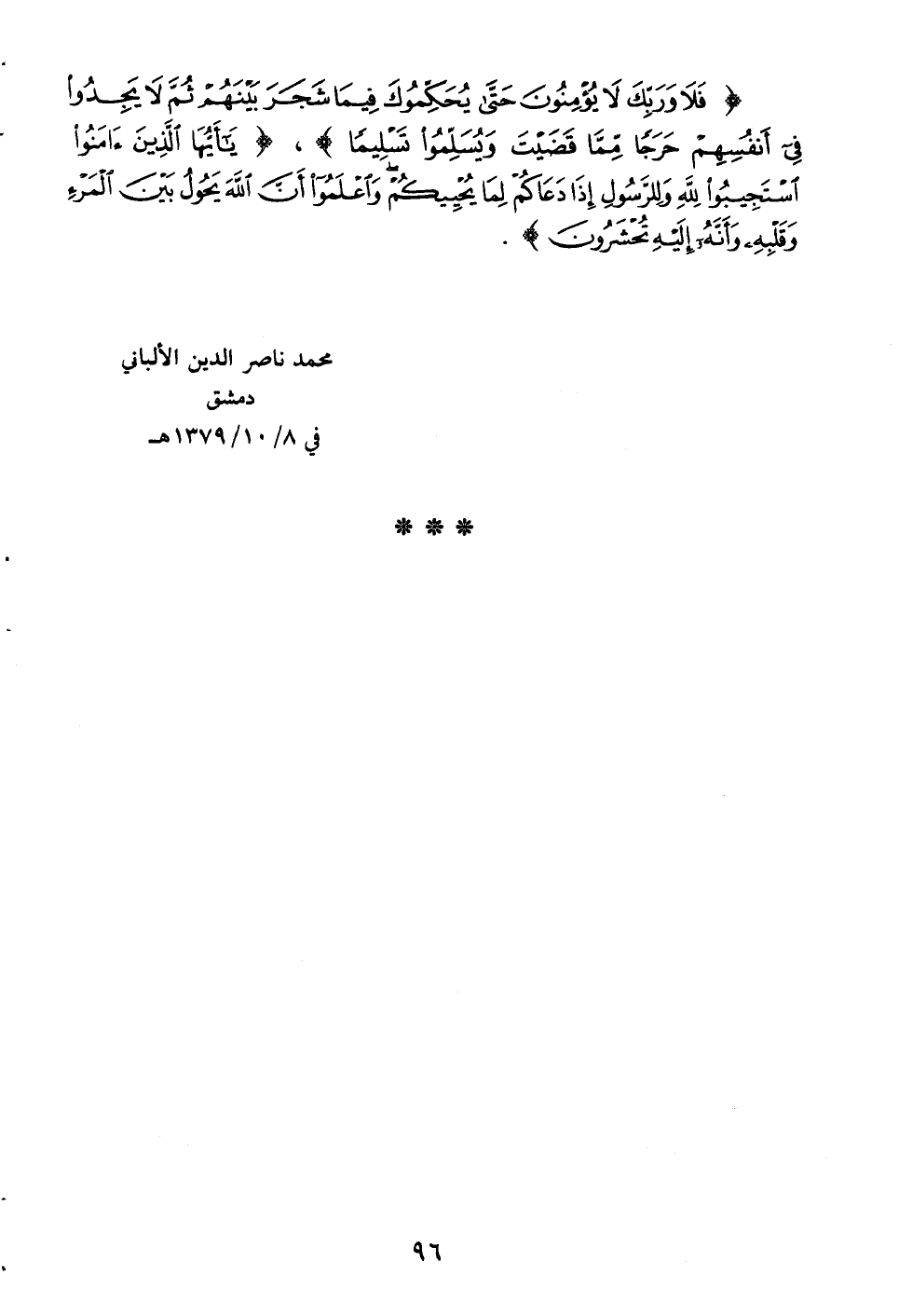 {فلا وربك لا يؤمنون حتى يحكموك فيما شجر بينهم، ثم لا يجدوا في أنفسهم حرجاً مما قضيت ويسلموا تسليما}، {يا أيها الذين آمنوا استجيبوا لله وللرسول إذا دعاكم لما يحييكم، واعلموا أن الله يحول بين المرء وقلبه، وأنه إليه تحشرون}.