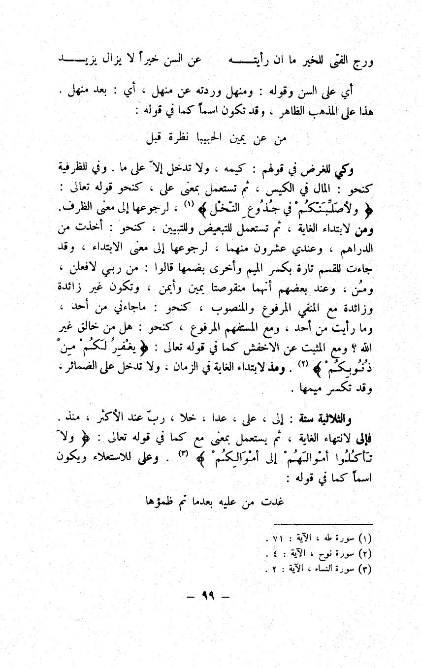 والقسم الرابع وهي الناصبة للفعل أربعة عند سيبويه ومن تابعه: أحدها أن وهو يفيد معنى المصدر ويخصص المضارع بالاستقبال وأنه في الاستعمال يظهر تارة ويضمر أخرى إما واجبا وذلك بعد خمسة أشياء: لام تأكيد النفي كما في قوله تعالى " وما كان الله ليعذبهم " وفاء جواب الأمر والنهي والنفي والاستفهام والتمني والعرض كنحو ائتني فأكرمك ولا تشتمني فأشتمك وما تأتينا فتحدثنا بمعنى ما تأتينا فكيف تحدثنا: أي لا إتيان ولا حديث كنحو: