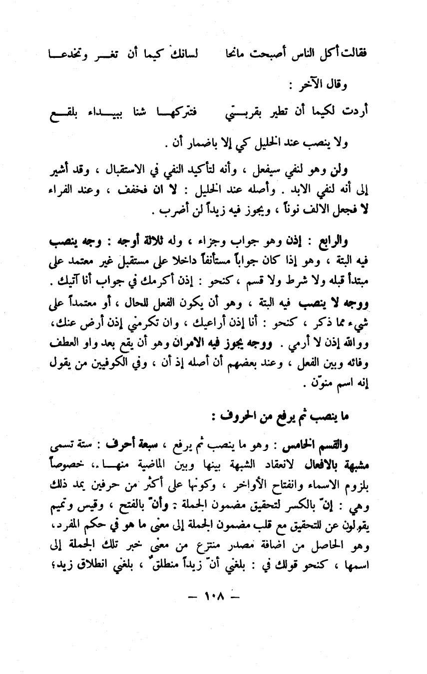 أو لخلاف أن يكون كذلك للتذكير نحو زيد قالا أو يقولوا إذا تذكرت المقول ومن العامي إلا أن الألف ولواو لا يحرك لهما ساكن بخلاف الياء كنحو: وكأن قدي وآلت حلفه لم تحللي في الإطلاق وكذا نحو قدي وعلى إذا تذكرت قد قام والغلام مثلا ونحو أزيدنيه في زيد بالتنوين أو زيداًنيه بزيادة ان إذا تذكرت أو أنكرت وجميع ذلك أشياء وقفية فاعلم، والهاء للدلالة على الغيبة في إياه عند الأخفش كالكاف والياء فيه للخطاب والحكاية عنده وللوقف كالشين المعجمة بعد كاف المؤنث في تميم وغير المعجمة بعده في بكر ومدار الكلام في حرفيتها: أعني الهاء والكاف والياء على بيان تعدد كونها مجرورة أو منصوبة، واللام يأتي في جواب لو ولولا لزيادة الربط غير واجب في وجواب القسم نحو والله لزيد قائم أو ليقومن أو لقد قام واجبا على الأعرف وفي الشرط يتقدمه توطئة له نحو والله لئن أكرمتني لأكرمتك غير واجب، وتسمى الموطئة للقسم وتأتي لتأكيد مضمون الجملة الاسمية نحو لزيد منطلق وتسمى لام الابتداء وهي تجامع أن على أربعة أوجه أن تدخل على اسم إن مفصولا بينه وبينها كنحو إن في الدار لزيد أو على ما يجري مجراه من الضمير المتوسط بينه وبين الخبر فصلا كان كنحو إني زيداً لهو المنطلق أو أفضل منك أو خير منك أو ينطلق أو غير فصل كنحو إن لهو منطلق أو على الخبر كنحو أن لآكل أو ليأكل وتخصص المضارع بالحال أو على متعلق الخبر إذا كان متقدما كنحو أن لطعامك آكل، ومن شأنها إذا خففت أن ولم تعمل أن تلزم فرقا بينها وبين إن النافية وتسمى إذ ذاك الفارقة نحو إن زيد لمنطلق وكذا أن كان زيد لمنطلقاً وأن ظننت لزيد منطلق وكذا عند الكوفيين نحو: إن تزينك لنفسك وإن تشينك لهيه، وعندنا أن هذا الكلام مما لا يقاس عليه وقد جامعها على وجه خامس حيث قالوا