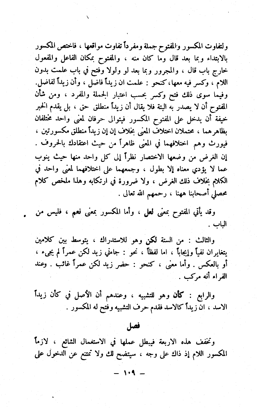 لهنك كذا ولكذا على قول من لا يجعل الأصل والله إنك وعلى مذهب سيبويه تأتي للتعريف نحو العلام والهمزة عنده للوصل ولذلك لا نثبت فيه بخلاف الخليل فان سقوطها عنده لمجرد التخفيف لكثرة دورها والتعريف بها إما أن يكون للجنس وهو أن تقصد بها نفس الحقيقة معينا لها كنحو الدينار خير من الدرهم أو للعهد وهو أن تقصد بها الحقيقة مع قيد الوحدة أو ما ينافيها معينا لذلك كنحو جاءني الرجل أو الرجلان أو الرجال وقد ظهر من هذا أن لا وجه لاعتبار الاستغراق في تعريف الجنس إلا ما سيأتيك في علم المعاني. والنون تأتي للصرف كنحو زيد وللتنكير كنحو صه وعوضا عن المضاف إليه نحو حينئذ ومررت بكل وجئتك من قبل عندي وكذا كل غاية إذا نونت فليتأمل ونائبا مناب حرف الإطلاق في لإنشاد بني تميم كنحو أفلى اللوم عاذل والعتابن وقولي، وغالبا كنحو وقاتم الأعماق خاوي المخترقن مشتبه الأعلام، ويسمى في جميع ذلك تنوينا ويلزمه السكون إلا عند ملاقاة ساكن فإنه يكسر أو يضم حينئذ على تفصيل فيه كنحو وعذاب أركض وربما حذف كنحو قراءة من قرأ - " قل هو الله أحد الله الصمد " - وتأتي للتأكيد كما سبق ولا يؤكد به إلا الأمر والنهي والاستفهام والتمني والعرض والقسم والشرط المؤكد حرفه بما كنحو فإما ترين ونحو إن تفعلن بدون ما لا يقع إلا في ضرورة الشعر وقالوا بجهد ما تبلغن وبعين