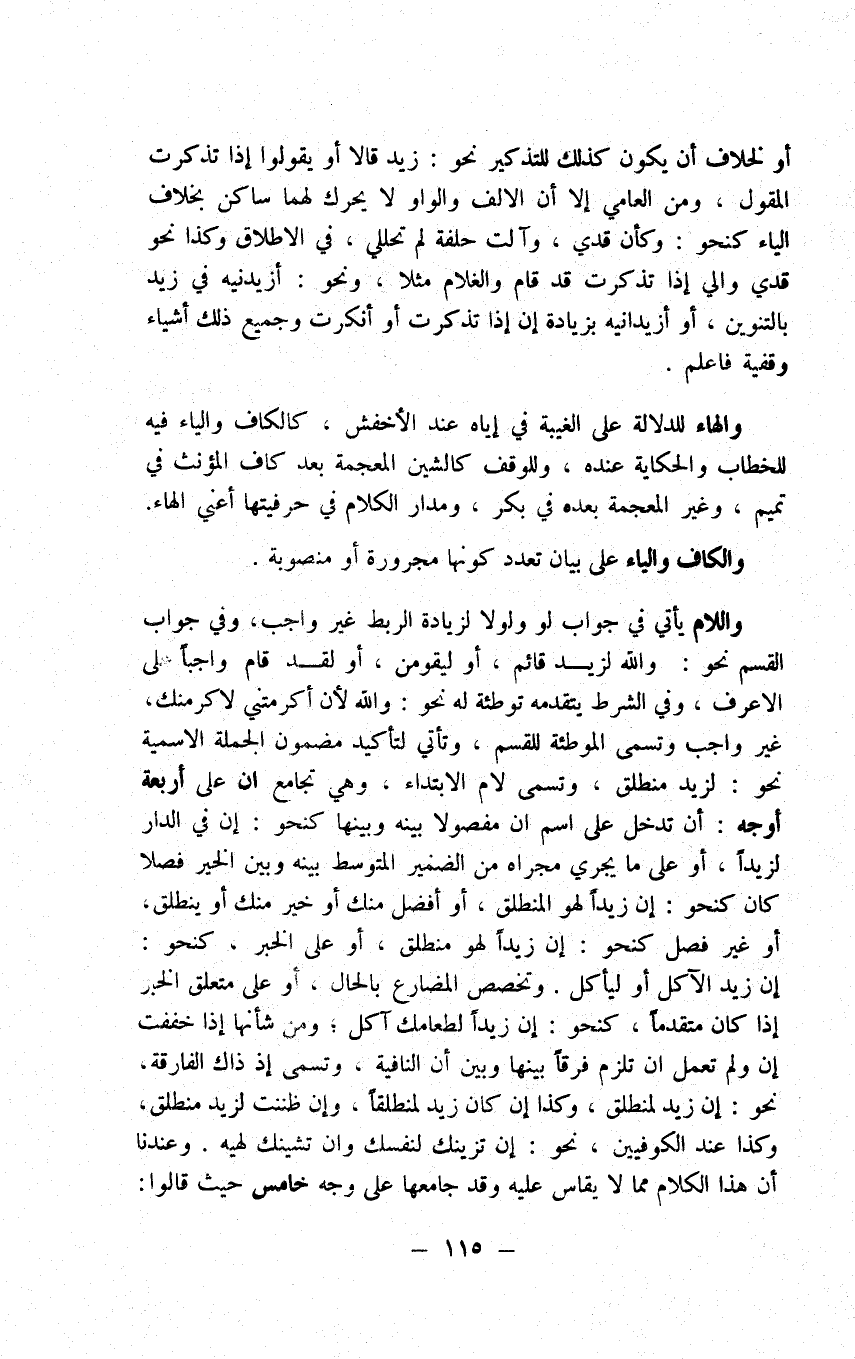ولا يمتنع عندي أن تكون إن في البيت هي المشبهة والهاء اسمها لا للوقف بمعنى إنه كذلك وجير بكسر الراء وقد تفتح نظير أجل ويقال جير لأفعلن بمعنى حقا. ونعم للتصديق في الخبر ولتحقيق في الاستفهام مثبتين كانا أو منفيين وكنانة تكسر العين منها. وسوف للاستقبال كالسين وعند أصحابنا أن فيها زيادة تنفيس بناء على أن زيادة الحرف لزيادة المعنى والمراد زيادة الحرف في إحدى كلمتين ترجعان على معنى واحد وأصل كذلك ويدخل عليهما عندنا للام الابتداء. وثم في للعطف للترتيب مع التراخي زمانا أو مرتبة وقد يقال ثمت. وبلى للإيجاب لما بعد النفي مستفهما أو غير مستفهم والضرب الرابع: ستة أحرف: أما إما حتى كلا لما لكن. فأما فيها معنى الشرط فقولك أما زيد فمنطلق بمنزلة مهما يكن من شيء فزيد منطلق ولها عند سيبويه رحمه الله خاصية في تصحيح التقديم لما يمتنع تقديمه فيجوز أما هندا فإن عمر أضارب